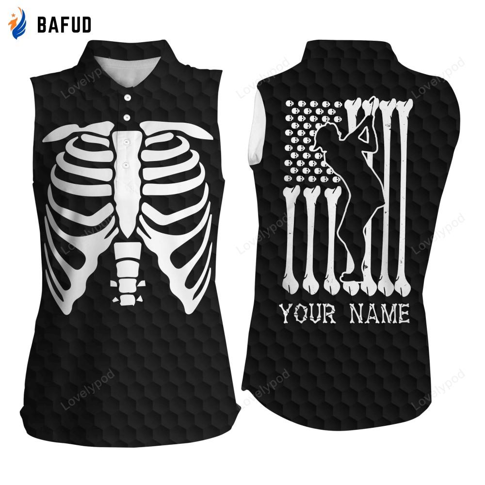 Introducing our Personalized Funny Boner Women's Sleeveless Polo Shirt, a unique blend of style, humor, and patriotism. This Skeleton American Flag Custom Name Black White Golf Shirt is designed to turn heads and bring a smile to your face.