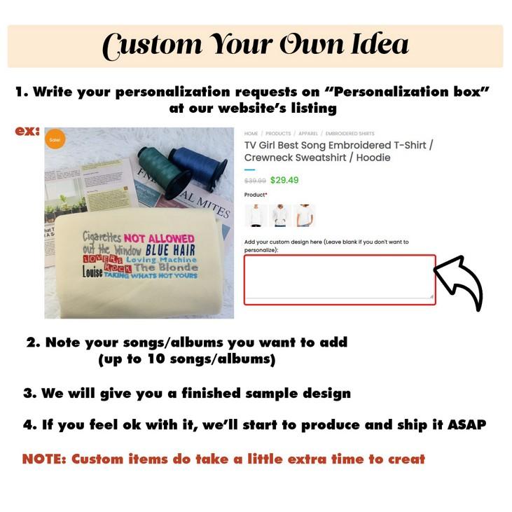 Introducing our Custom Embroidered Crewneck T-Shirt/Sweatshirt, a must-have for music enthusiasts! Made for both men and women, this shirt showcases your favorite songs or albums. Our high-quality embroidery ensures durability and style. With endless customization options, you can express your unique taste. Whether you're attending a concert or lounging at home, this shirt will make you stand out in a crowd. Embrace your love for music and elevate your fashion game with our Custom Embroidered Crewneck T-Shirt/Sweatshirt. Get yours now!