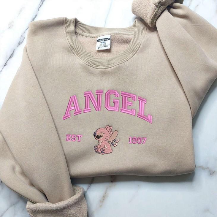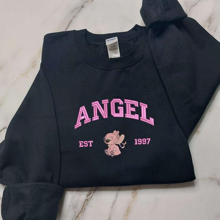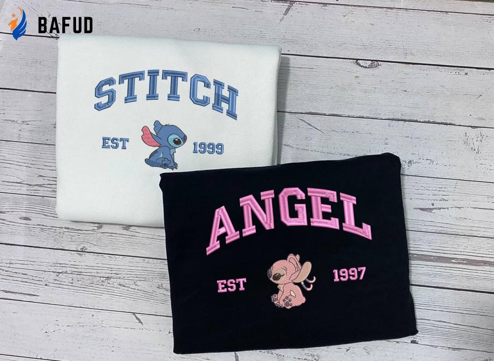 Stitch and Angel Embroidered SweatshirtCouple Cartoon Shirt for Valentine Gift with Unique Valentine Embroidery Designs