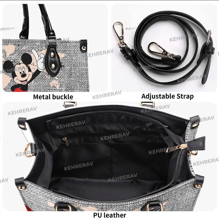 Introducing our Custom Name Mickey Cute Leather Handbag, the ultimate accessory for all Mickey lovers! Made with premium leather, this handbag exudes elegance and durability. Personalize it with your name and make it uniquely yours! With its spacious interior and multiple compartments, it offers convenience and organization. Whether you're heading to work, a day out, or a special occasion, this handbag will elevate your style while showcasing your love for Mickey. Surprise your mom on Mother's Day with this exquisite gift that she'll cherish forever. Our Mickey Women Purses are designed to add a touch of magic to your everyday life. Experience the joy of owning a custom leather bag that reflects your personality and love for Mickey, while enjoying the functionality and quality it offers. Order yours now and embrace the enchantment! Due to the different monitor and light effects, the actual color of the item might be slightly different from the visual pictures. The leather bag. This item is a must-have for any woman, suitable from workday to the weekend outing. It is roomy and comfortable to carry, thanks to its shoulder straps and rolled leather top handles. Fashioned from supple-grained leather printed on both sides, creating a stylish contrast in color.