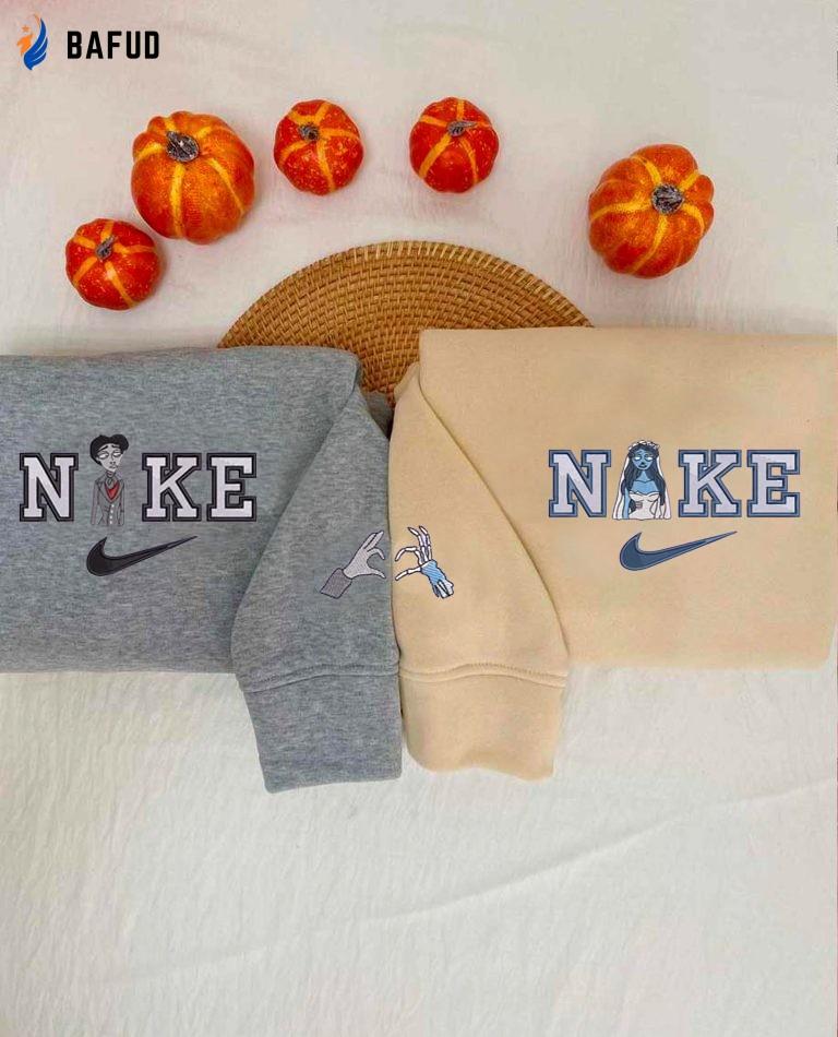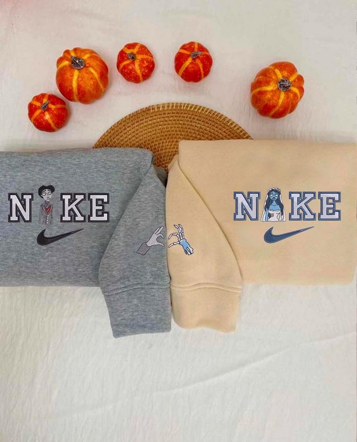 Introducing the Nike x Victor Van Dort and Emily Matching Embroidered Crewneck T-Shirt and Sweatshirt! This stylish and unique collaboration brings together the iconic Nike design with the beloved characters from "Corpse Bride." Made for both men and women, these shirts are the perfect gift for any fan of the film. The high-quality embroidery adds a touch of sophistication, while the comfortable fabric ensures all-day comfort. Stand out from the crowd with this limited edition collection that showcases your love for both fashion and Tim Burton's masterpiece. Get yours now and embrace the magic of "Corpse Bride" in style!