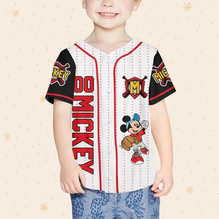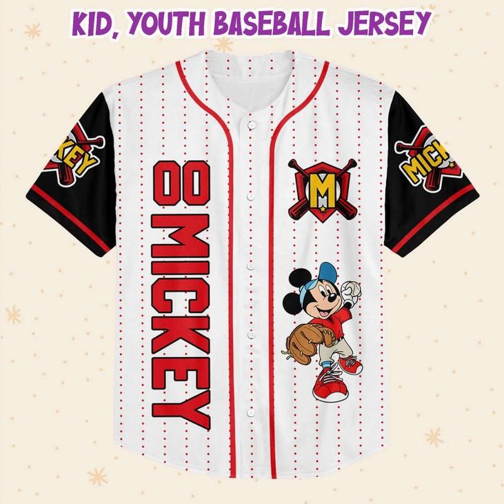 Baseball Red White Disney Baseball Jersey! Made from premium materials, this jersey is designed to keep you comfortable and stylish on and off the field. The vibrant red and white colors, adorned with the iconic Mickey Mouse logo, add a touch of Disney magic to your game. With the option to personalize your jersey with your name or favorite number, you can truly make it your own. The breathable fabric ensures optimal airflow, keeping you cool during intense gameplay. Whether you're a fan of Disney or a baseball enthusiast, this jersey is a must-have. Show off your love for the game and your favorite Disney character with this unique and eye-catching jersey. Get ready to hit a home run in style!