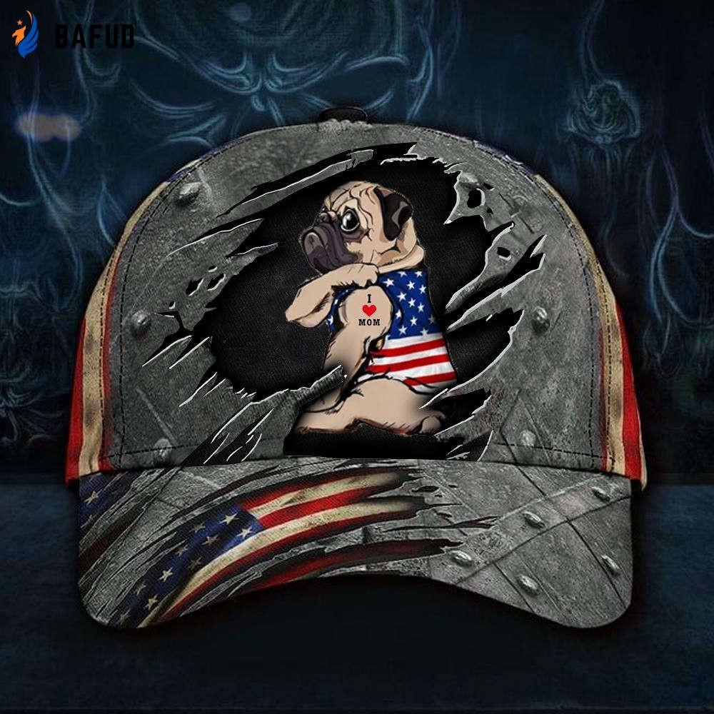 Join the trend and grab your Pug I Love Mom Hat today. Embrace your love for pugs, honor your mom, and express your patriotism in style. It's time to make a statement and stand out from the crowd with this must-have cap. Order now and experience the joy of being a proud pug mom!