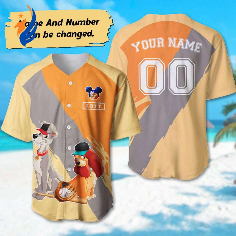 Introducing our Personalized Lady and the Tramp Baseball Jersey, a must-have for Disney fans and dog lovers alike! This custom jersey features the iconic Lady and the Tramp characters, beautifully embroidered with your own personal touch. Made with high-quality materials, this jersey offers both style and comfort. With its unique design, this baseball jersey is sure to make you stand out from the crowd. Whether you're a fan of the classic Disney movie or simply love dogs, this jersey showcases your passion in a fashionable way. Perfect for casual outings, sports events, or even as a thoughtful gift for a loved one. Join Lady and Tramp on their romantic adventures and show off your love for Disney and dogs with this one-of-a-kind baseball jersey.