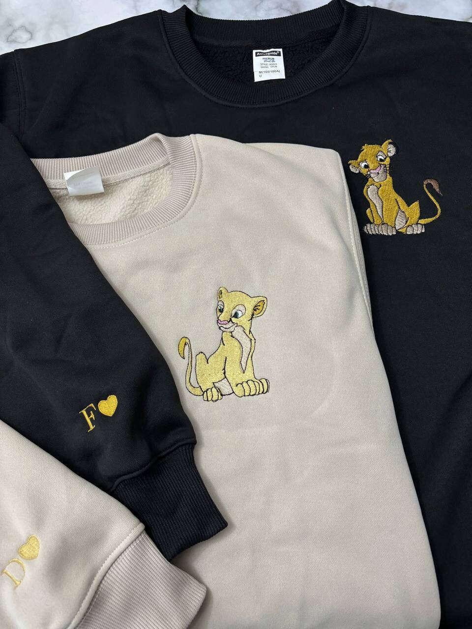Introducing our Simba and Nala Embroidered Sweatshirts, inspired by the timeless love story of Lion King. These trending crewneck shirts are not just a couple shirt, but a symbol of love and commitment. Made with premium quality fabric, the intricate embroidery showcases the iconic characters, Simba and Nala, in their most endearing moments. Perfect for any occasion, these sweatshirts make an ideal gift for your loved one, especially for Valentine's Day. Embrace the warmth and comfort, while celebrating your love with these stylish and meaningful Lion King shirts. Order yours now and let the magical bond of Simba and Nala inspire your own love story!