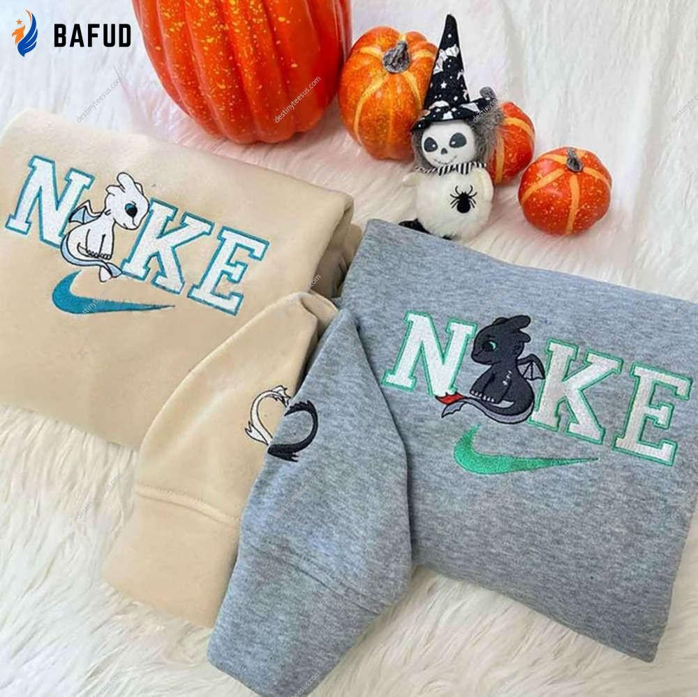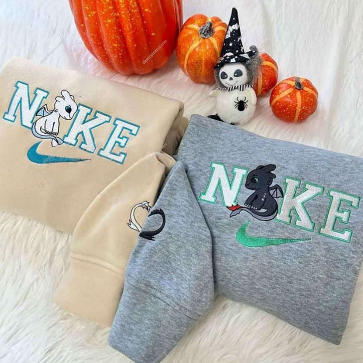 The Nike x Toothless and Light Fury Embroidered Crewneck TShirt is a must-have for dragon enthusiasts. Made with premium quality fabric, this shirt boasts intricate embroidery of the beloved characters Toothless and Light Fury. With its comfortable fit and stylish design, it's perfect for both men and women. Show your love for dragons while staying fashionable and comfortable. Get yours now and join the dragon fandom!