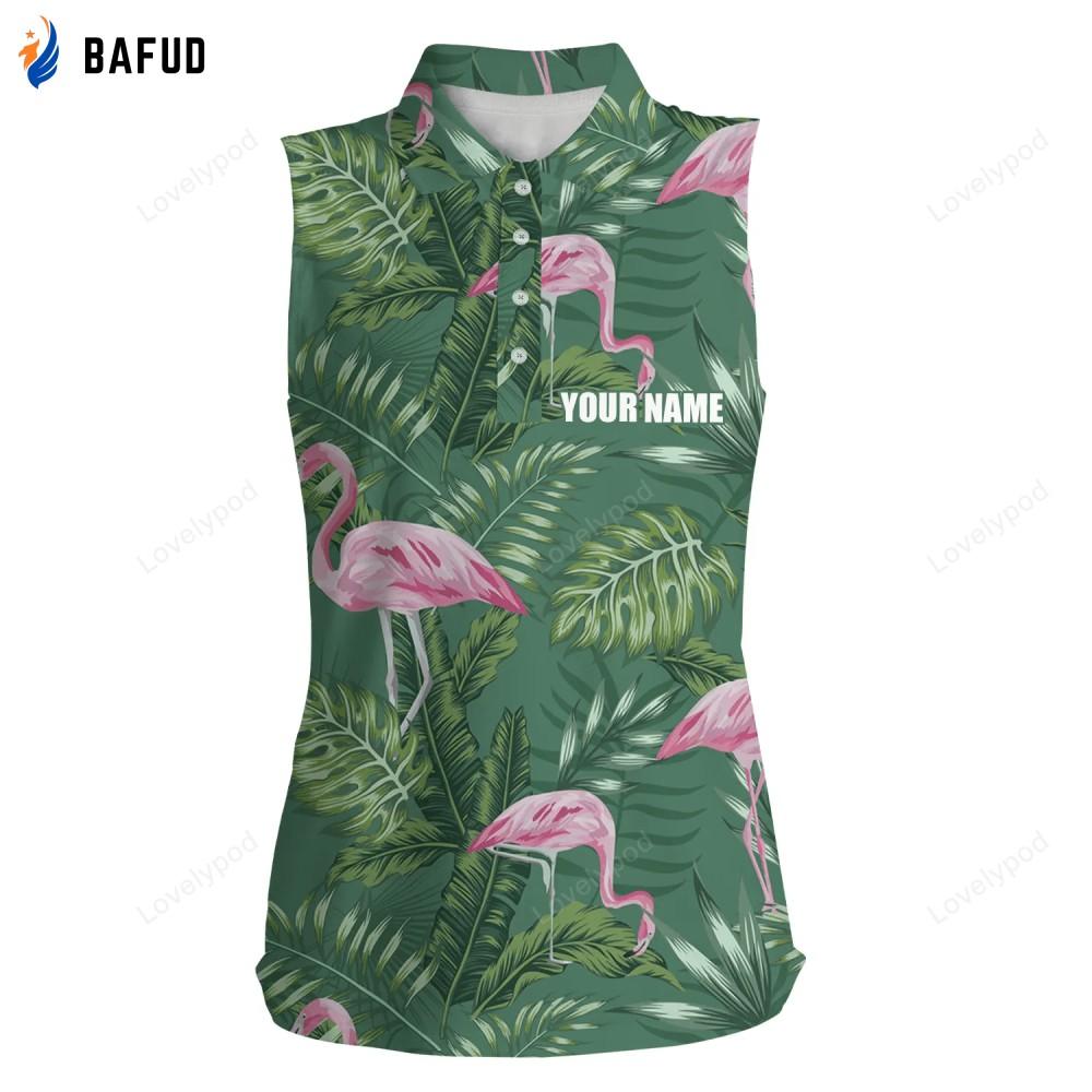 Introducing our vibrant Women Sleeveless Polo Shirt in a refreshing shade of green, adorned with tropical plants, monstera leaves, and a playful flamingo design. This custommade golf top is designed exclusively for women who want to make a statement on the golf course.