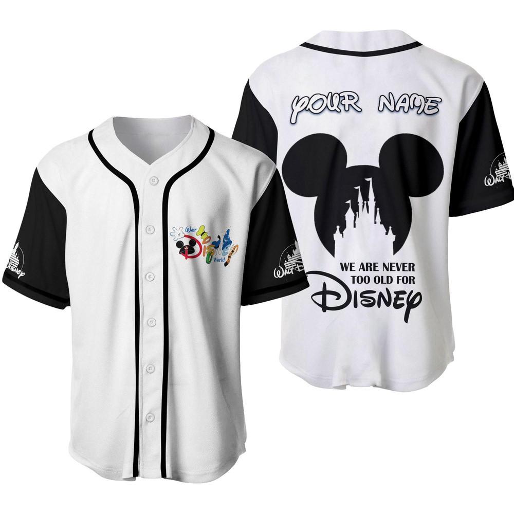Introducing our Mickey Mouse Disney, Mickey Magic We Are Never Too Old For Disney Black And White Custom Baseball Jersey Personalized Shirt! Embrace your inner child with this oneof-a-kind, officially licensed Disney product. Made from highquality materials, this baseball jersey features a classic black and white design adorned with an iconic Mickey Mouse print. Our customization option allows you to add your name or any text, making it truly unique. Perfect for Disney enthusiasts of all ages, this shirt combines comfort and style effortlessly. Whether you're heading to a Disney park or simply want to show off your love for Mickey, this personalized shirt is a must-have. Stand out from the crowd and relive the magic with our Mickey Mouse Disney baseball jersey. Order yours today and make memories that will last a lifetime!