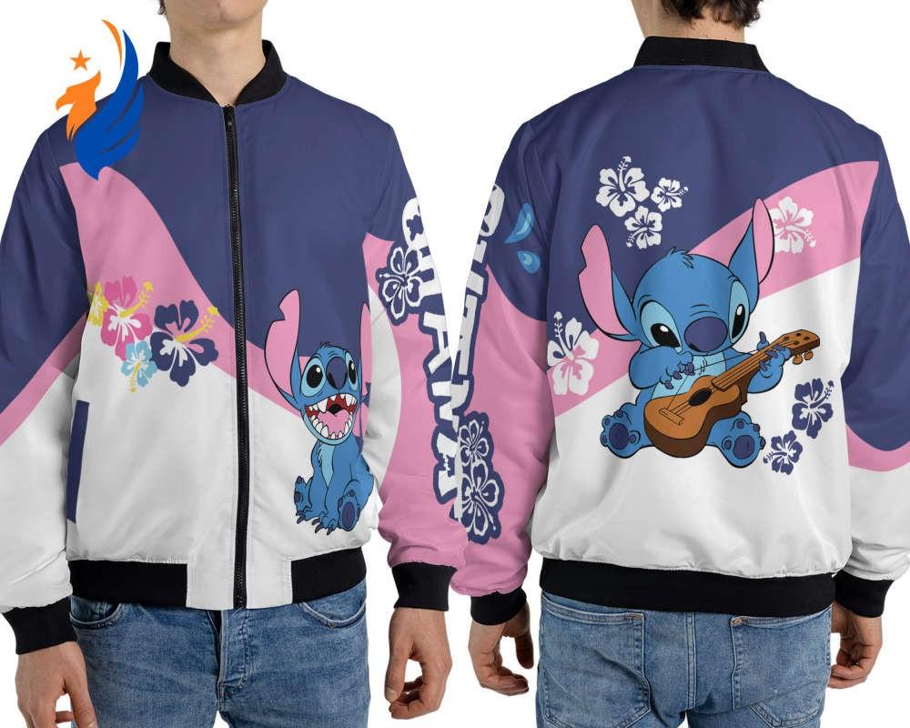 Stitch Guitar Fleece Bomber Jacket - Disney Streetwear for Disneyland Family Trip & Birthday Gift