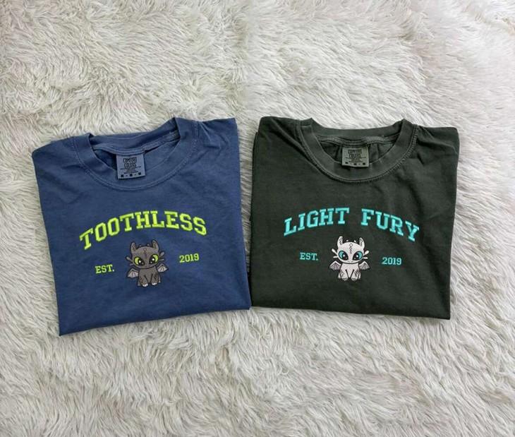 This Toothless and Light Fury Embroidered Comfort Colors Tee is the perfect way to show off your love for dragons and each other. Made from soft and comfortable fabric, this couple shirt features detailed embroidery of Toothless and Light Fury from the beloved movie "How To Train Your Dragon." The shirt is designed to provide a relaxed fit and is available in various sizes to suit your needs. It makes an ideal couple gift, symbolizing your bond and shared interests. With its high-quality construction and attention to detail, this Dragon's Couple Shirt is sure to become a favorite in your wardrobe. Embrace the magic of dragons and celebrate your love with this unique and stylish tee.