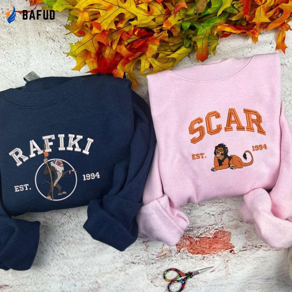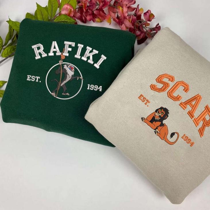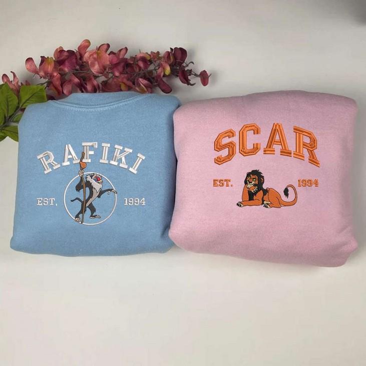 Introducing our Rafiki and Scar Embroidered Sweatshirts, Lion King Shirts! Designed with intricate embroidery, these crewneck sweatshirts are a must-have for all Lion King fans. Made from premium quality materials, they offer unbeatable comfort and durability. The unique design showcases the iconic characters Rafiki and Scar, adding a touch of nostalgia to your wardrobe. Perfect for couples, these shirts make a great matching outfit for a fun and stylish look. Embrace the Y2K fashion trend with these versatile sweatshirts, suitable for any occasion. Surprise your dad on Father's Day with this thoughtful and memorable gift. With our ESH369-370 collection, enjoy the perfect blend of style, comfort, and nostalgia. Grab yours now and relive the magic of Lion King wherever you go!