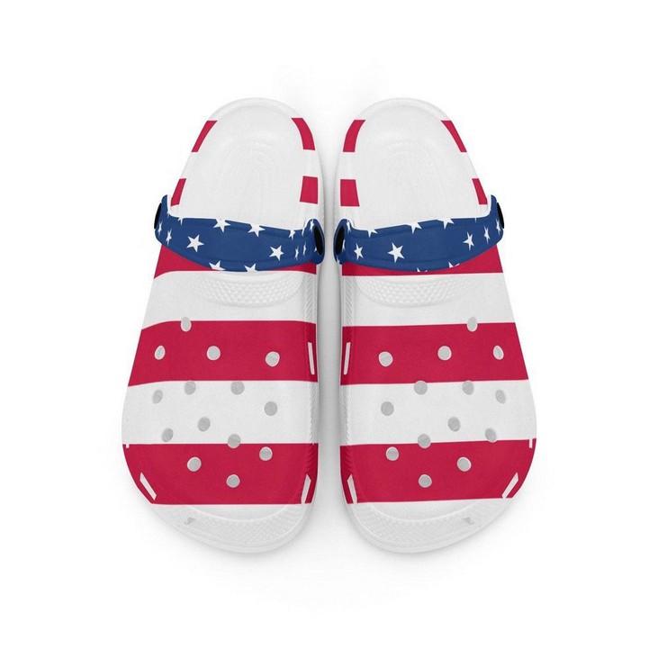 But what sets these Crocs apart is the American Flag design. Show off your patriotism with pride! The vibrant flag pattern adds a touch of flair to your outfit, making a bold and impactful fashion statement. Whether it's Independence Day, Veterans Day, or any other occasion celebrating the USA, these shoes will make you the center of attention.
