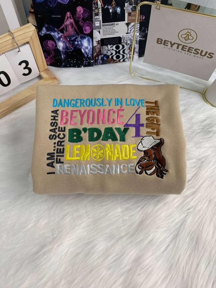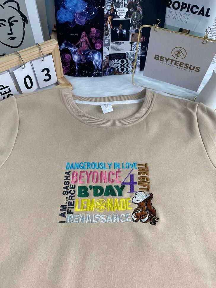 The Beyonce Full Album Embroidered Crewneck T-Shirt is a must-have for all music lovers. With its vibrant design showcasing Beyonce's iconic albums, this shirt is a statement piece that stands out from the crowd. Made with premium quality fabric, it offers comfort and durability. Whether you're a man or a woman, this sweatshirt is the perfect addition to your wardrobe. Show your love for Beyonce and her incredible music with this stylish and unique shirt. Elevate your style and make a bold fashion statement with this Beyonce Full Album Embroidered Crewneck T-Shirt. Get yours now and let the world know you're a true fan!