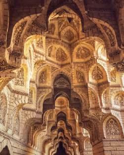 d’une vaste cour intérieure d’environ 20 x 21.5 mètres, entourée d’arcades à arcs brisés décorés de muqarnas (stalactites sculptées) d’une finesse artistique remarquable. Sur le flanc est du bâtiment, on compte 16 pièces, faisant face à 18 pièces sur le flanc ouest, portant le total à plus de quarante pièces, en plus de cinq grandes salles et de plusieurs