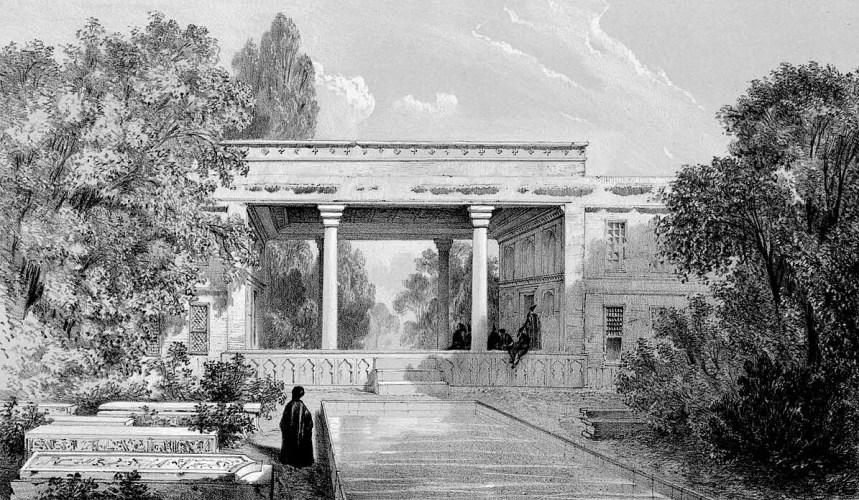 Figure 1 Eugene Flandin, 1840s. Drawing of the Mausoleum of Háfiz as it would have appeared in the 1840s