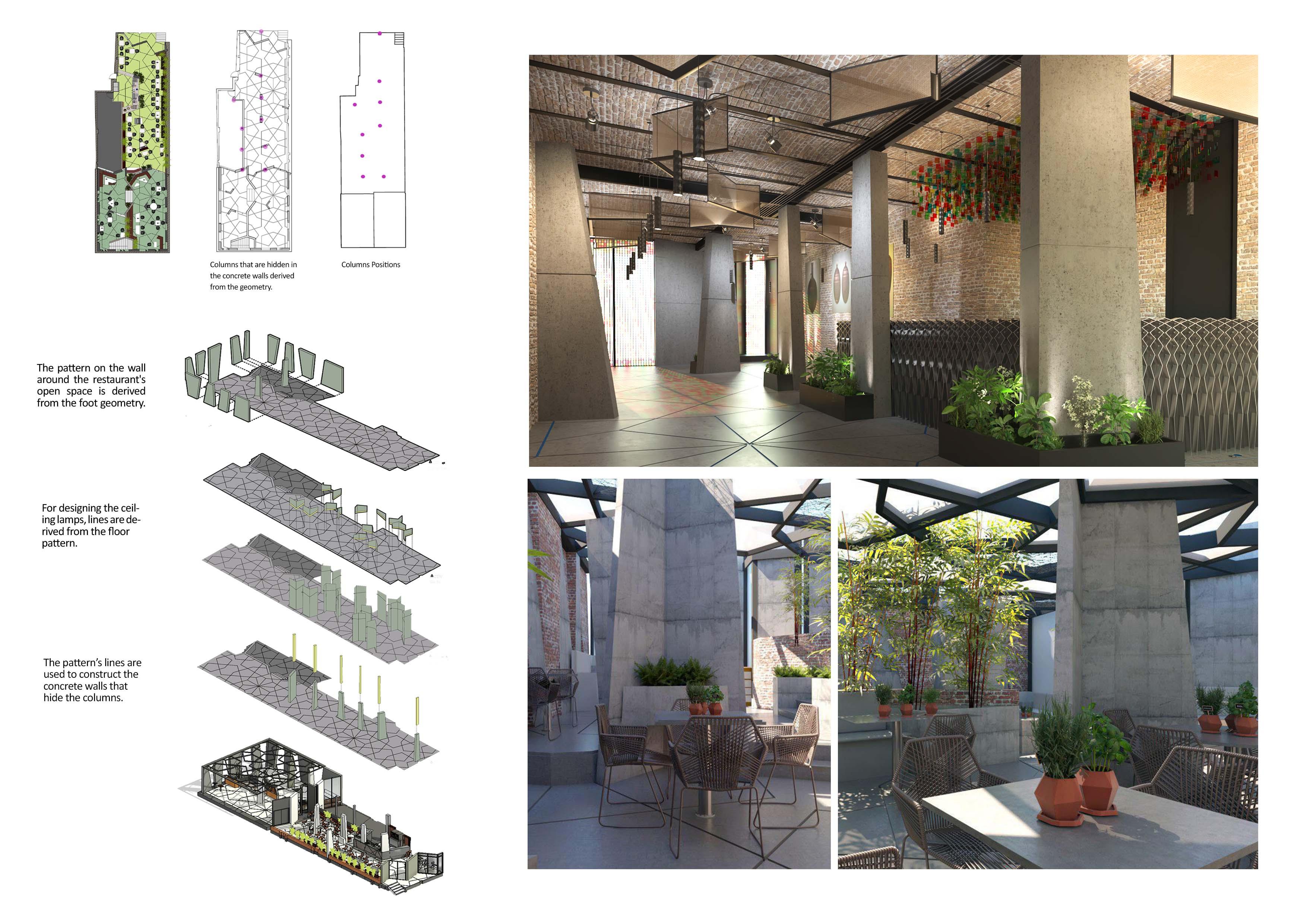 The existing building used to be dark and dated office buildings with a narrow entrances. After removing the walls, there were eight columns in the middle of the dining salon. Taking inspiration from traditional Persian architecture, we covered the floor with concrete slabs inthe form of an Islamic geometric pattern. This is the central theme of the design: this geometry appears on the walls and awning of outdoor space, the concrete walls that hide the columns are derived from the lines, and its projection on the ceiling defines the positions and forms of the lamps. The yard's awning, whichis intheshapeof thelslamic geometry pattern, is designed for both shading and blocking the view of the old commercial buildings inthe neighborhood. Iwasinvolved in the design and construction phase of this project. Rouhi Restaurant, one of the famous restaurants in Tehran, is currently operating in this building.