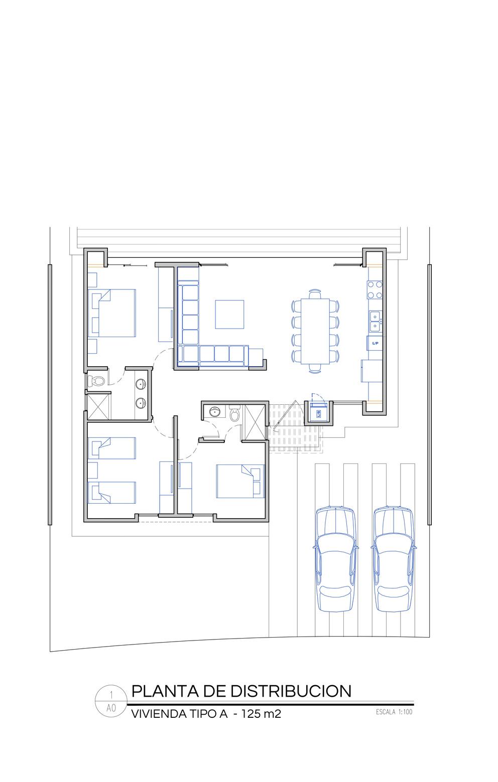 Tiene un área de 130 metros cuadrados en 1 nivel. Incluye 3 dormitorios, 3 baños, área de sala, comedor y cocina, con antesala al ingreso. Hay espacio para parqueo de 2 vehículos. Se adapta a cualquiera de los terrenos.
