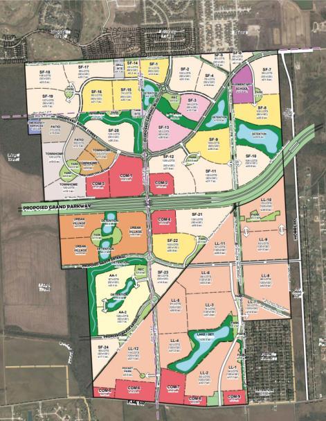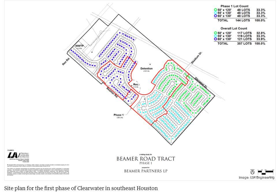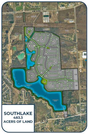 The plan calls for 357 single-family homes on 50, 55 and 60-foot lots, $350’s to $450’s. Phase 1 is in design; groundbreaking could occur Q4 2024; lot delivery in mid-2025.
