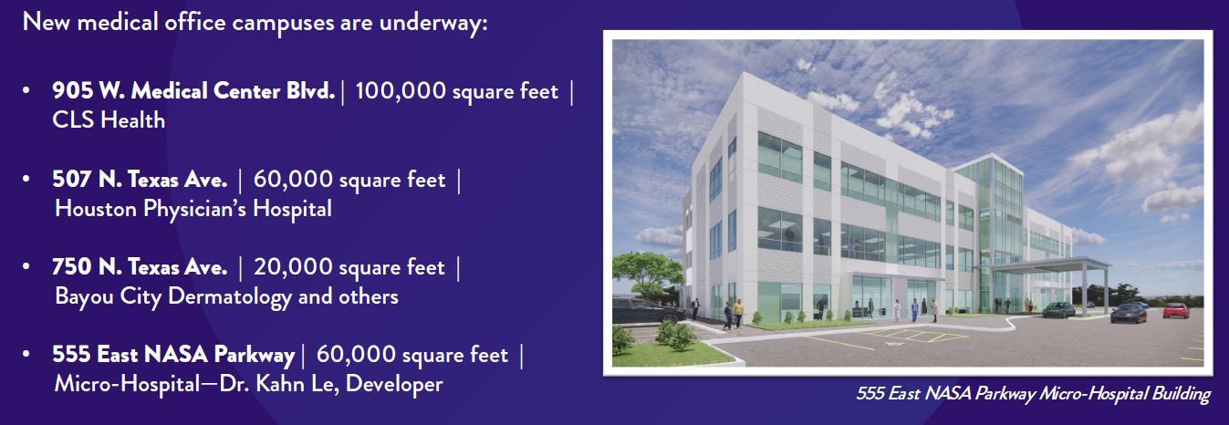 Townhomes planned next to Hilton in Nassau Bay. Dirt work underway. Pre-leasing! 80,000 SF medical office development. 3 stories. Structured parking. Saturn Lane at Space Park Drive