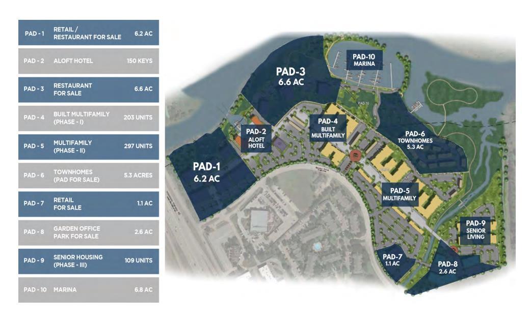 There will be a 52-acre public park, walking and biking trails, and a fishing lake with pier. The ~$700M project will also include a luxury hotel and convention center space accommodating 500 people.