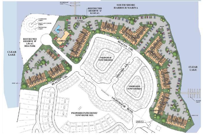 Underway: The southern development that fronts Clear Lake will have a restaurant, outdoor dining and entertainment, a 20-room boutique hotel. Four condo buildings of 40 units each will be 1,500 – 2,200 SF, low $400’s to mid $600’s. Forty-one townhomes priced from high $700’s.