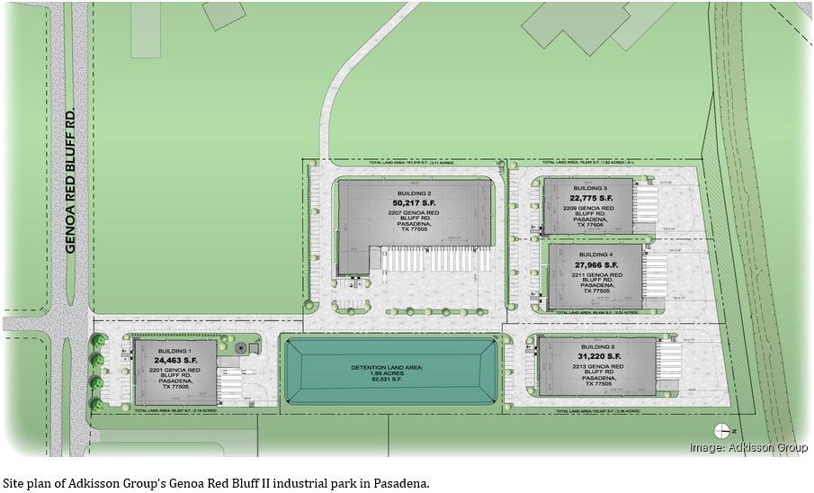Gulf Port Logistics Park, 3105 Genoa Red Bluff. Specs: 5 buildings ranging from 22,800 SF to 50,252 SF. All are 32’ clear height with one drive-in ramp and multiple dock-high doors, ESFR sprinklered, office to suit, auto parks, and truck courts. Each site ranges from 1.82 to 3.52 acres. A project by Adkisson Group Development.