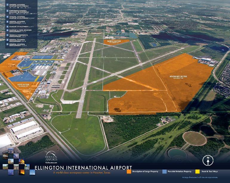 Approximately 658 acres are available for development in Ellington Airport. Best uses: office, aviation, institutional and industrial.