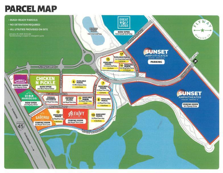 • Dual concept Marriott hotel (TownPlace Suites and Fairfield Inn) and a retail center, 8,700 SF, are under construction on13th St., west of SH 146. Developer is looking for restaurants to serve guests of the 435 area hotel rooms.