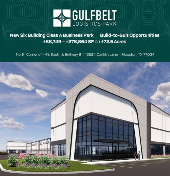 Gulfbelt Logistics Park planned on 72.5 acres. North corner of I-45 South and Beltway 8,12524 Conklin Lane in Houston. Six-building class A business park. BTS opportunities. 88,749 – 278,864 SF. Development by Trammell Crow Co.