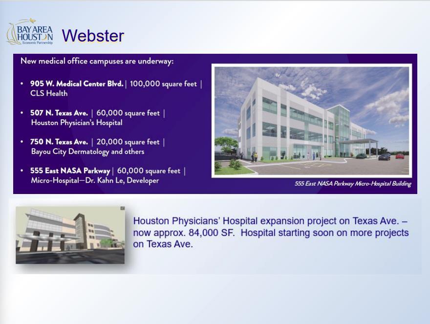 New medical facility on 17.5 acres –inpatient and outpatient – is in planning process. Available space also planned for 36,000 SF MOB and retail. On FM 1764 next to AMOCO FCU.