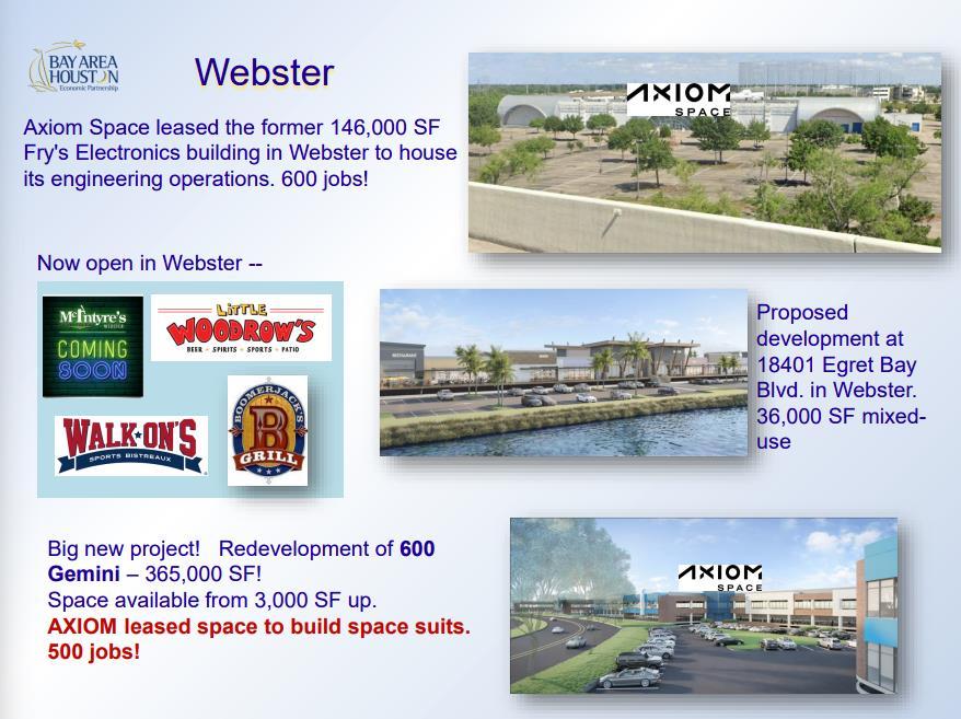 Completed construction and moved in at its new 116,000 SF campus on 8 acres. It will support spaceflight and host Houston’s first spaceflight accelerator of 10,000 SF. Includes manufacturing & lab space. This phase will create 250 new jobs.