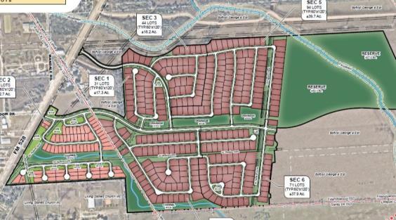 Georgetown – Approx. 312 Lots in Friendswood and 71 lots in Alvin. The subdivision includes 2 access points from FM 528.