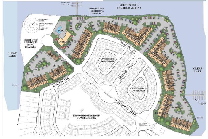 The southern development that fronts Clear Lake will have a floating barge with a restaurant, outdoor dining and entertainment, a 20-room boutique hotel. Four condo buildings of 40 units each will be 1,500 – 2,200 SF, low $400’s to mid $600’s. Forty-one townhomes priced from the $500’s - high $700’s.