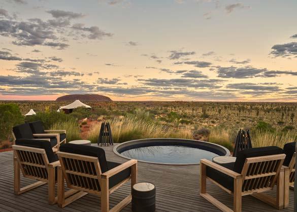 Perched high on the outback landscape, the Dune Top is an intimate space comprising a help-yourself bar, outdoor lounges and plunge spa with views to both World Heritage-listed natural icons Uluru and Kata Tjuta. Private dining pods offer a window to the flush of dusk in time for an intimate dinner under the stars. Pods are suites for small groups of up to 12 guests seated on separate dining pods.
