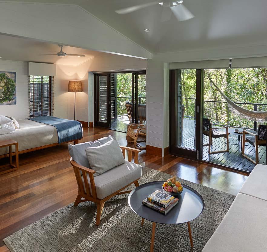 Boasting 40 luxury treehouse-style suites, the lodge offers refined luxury accommodation for up to 82 guests, including the exclusive two-bedroom Daintree Pavilion with multiple living spaces and an infinity pool. Interiors flow seamlessly to the outdoors with verandahs dotted with swaying hammocks, open-air showers and deep stone bathtubs.