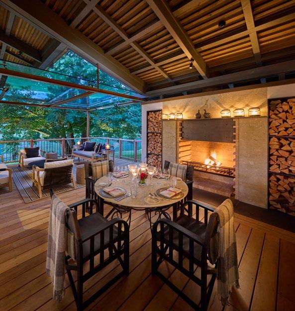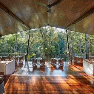 From the open-air reception – home to a convivial colony of decorative ceramic wildlife – guests are drawn into the cavernous spaces of the main lodge, an astonishing belvedere comprising the Treehouse Restaurant, lounge, bar and the well-named Jungle Perch, a comfortable hide for enjoying evening sundowners while birds and butterflies perform flash mob style among the treetops.