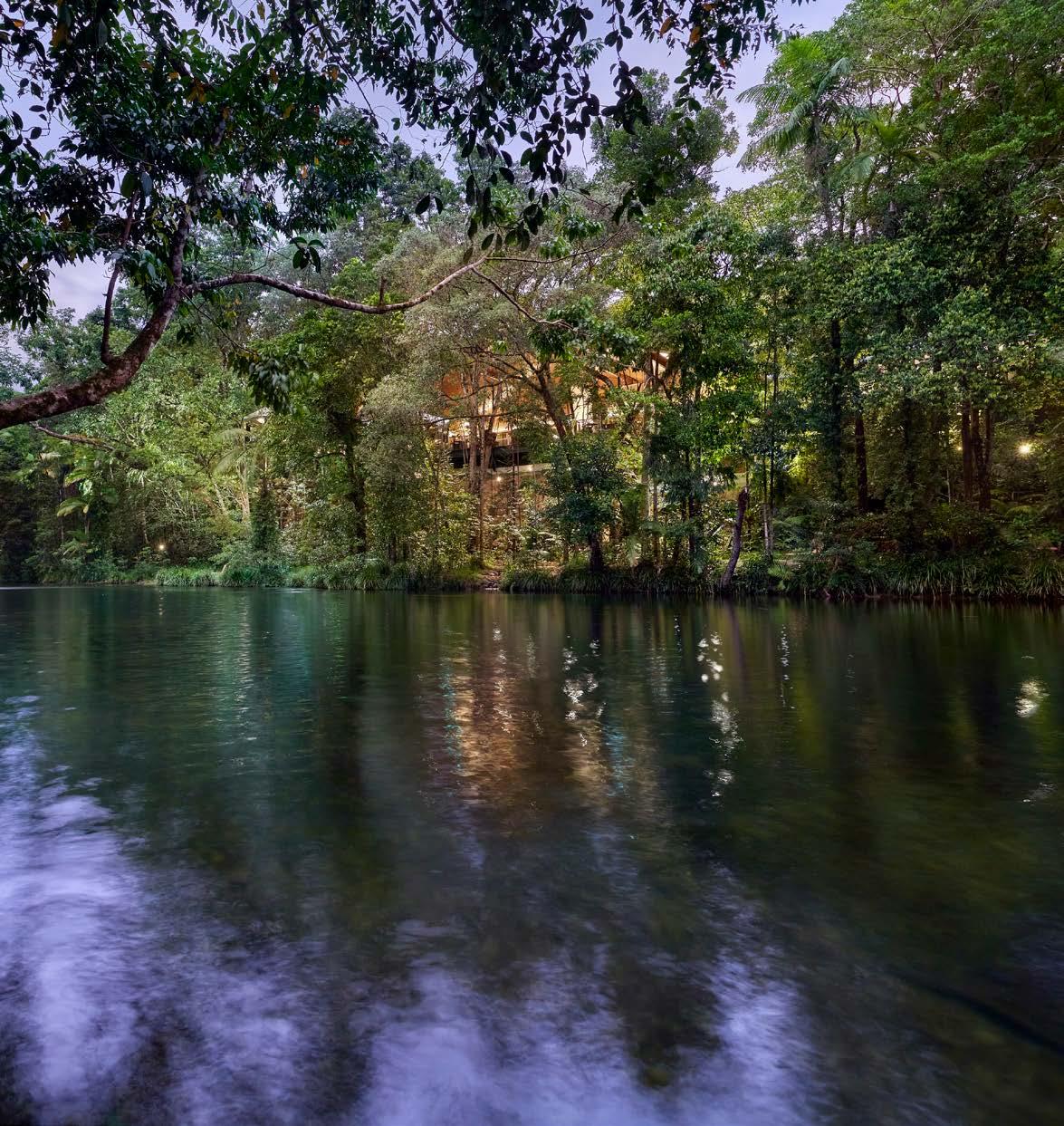 Nestled in the cool calm of the Daintree Rainforest, Silky Oaks Lodge is set above the gently flowing Mossman River and among the leafy canopy, with the airy, open spaces of the main lodge enveloping guests in the sights and sounds of an extraordinary natural theatre. Boasting 40 luxury treehousestyle suites, the lodge offers refined luxury accommodation for up to 82 guests, including the exclusive two-bedroom Daintree Pavilion with multiple living spaces and an infinity pool. Interiors flow seamlessly to the outdoors with verandahs dotted with swaying hammocks, open-air showers and deep stone bathtubs.