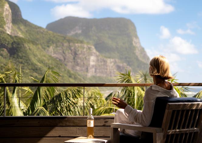 The Capella Suite features high ceilings with a beach house feel, offering cameo views of the ocean and mountains with kentia palms waving outside. Guests find a stylish refuge in this single level space, featuring king or twin bed options, a spacious ensuite bathroom, lounge area, outdoor deck with day bed and dramatic mountain and ocean views. A chic basaltdressed ensuite offers natural sky lighting and an oversized shower with generous dual heads allowing guests to rejuvenate in the remarkably soft, pure Lord Howe rainwater.