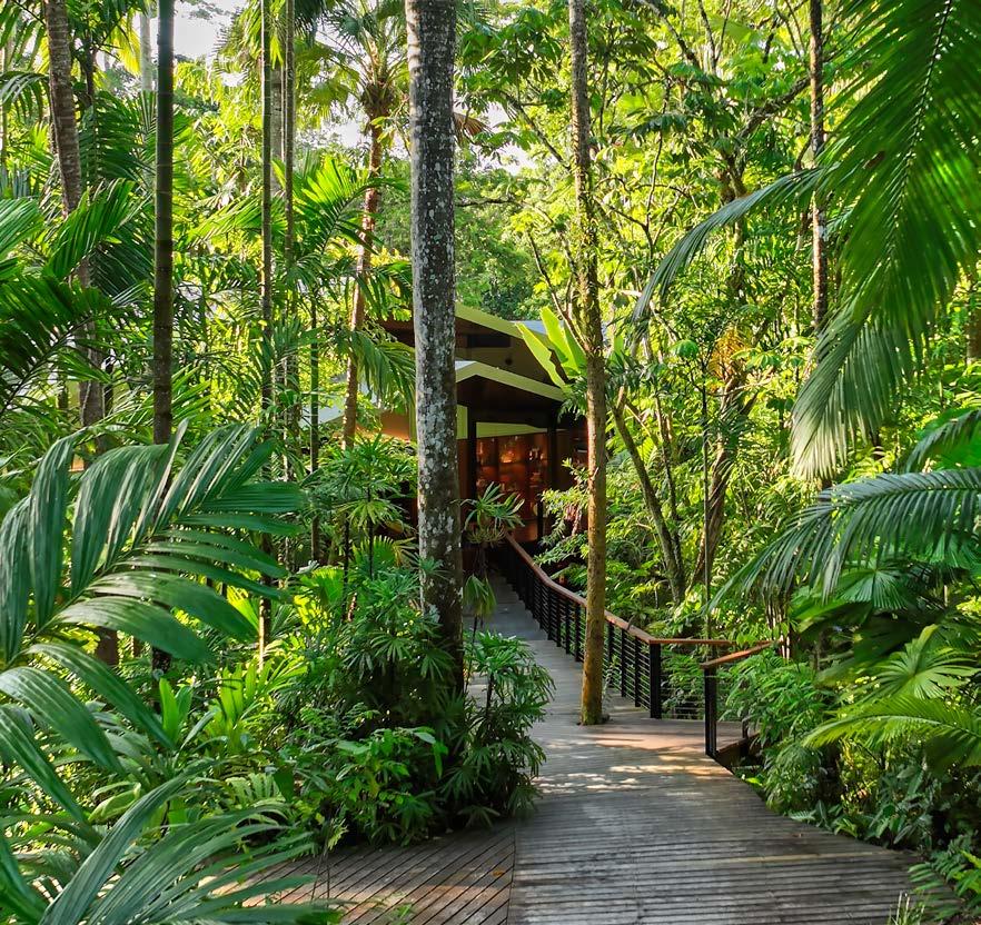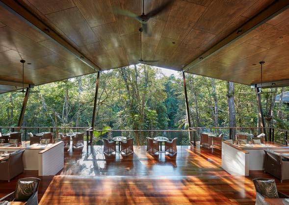 Set above the Mossman River and cradled in the lush rainforest canopy, the light-filled spaces of the main lodge open to an extraordinary living theatre.