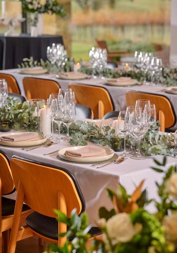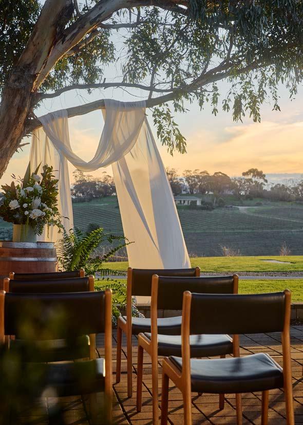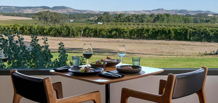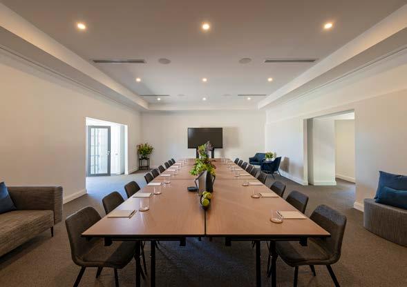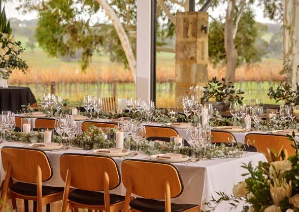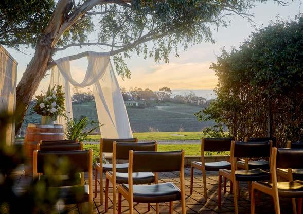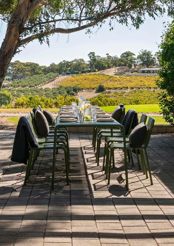 The light-filled Hermitage Room seats 24 or hosts 60 for cocktails, with a lounge for breakout moments and French doors opening to a courtyard and Barossa views.