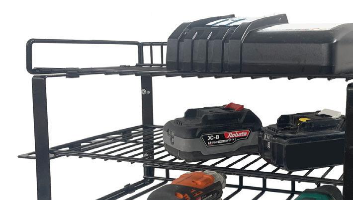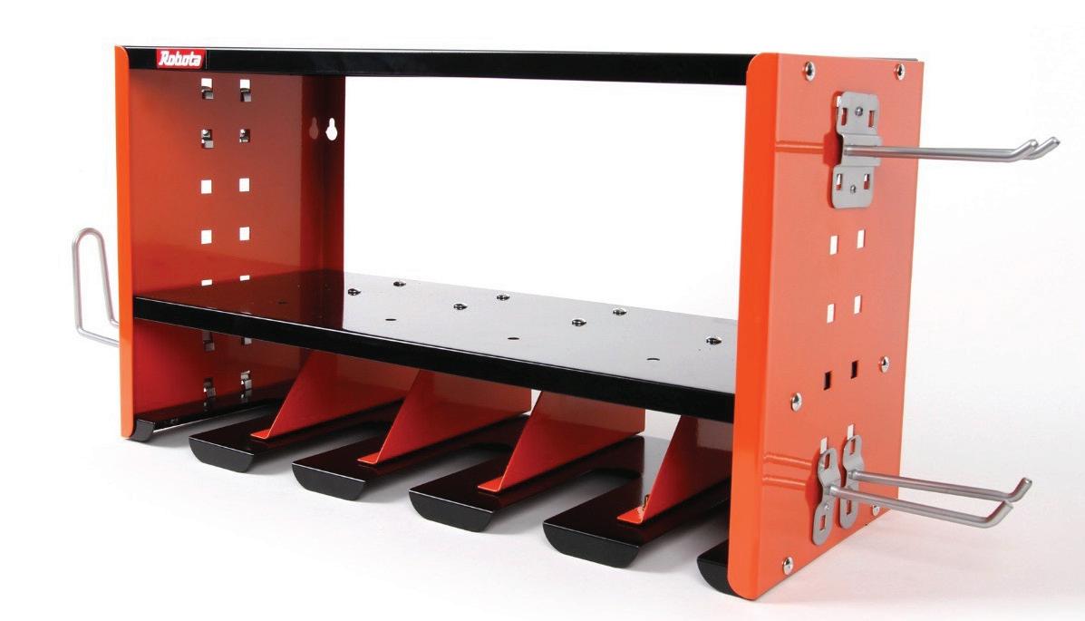Robotan akkuporakonetelineessä porakoneiden ja niiden akkujen säilyttäminen käy kätevästi ja siististi. Hyllyssä on kolme kerrosta, alimpaan porakoneet sopivat näppärästi ja kahteen ylimpään menee akut ja muita tarvittavia välineitä. Hyllyn asentaminen seinälle onnistuu neljän ruuvin avulla.