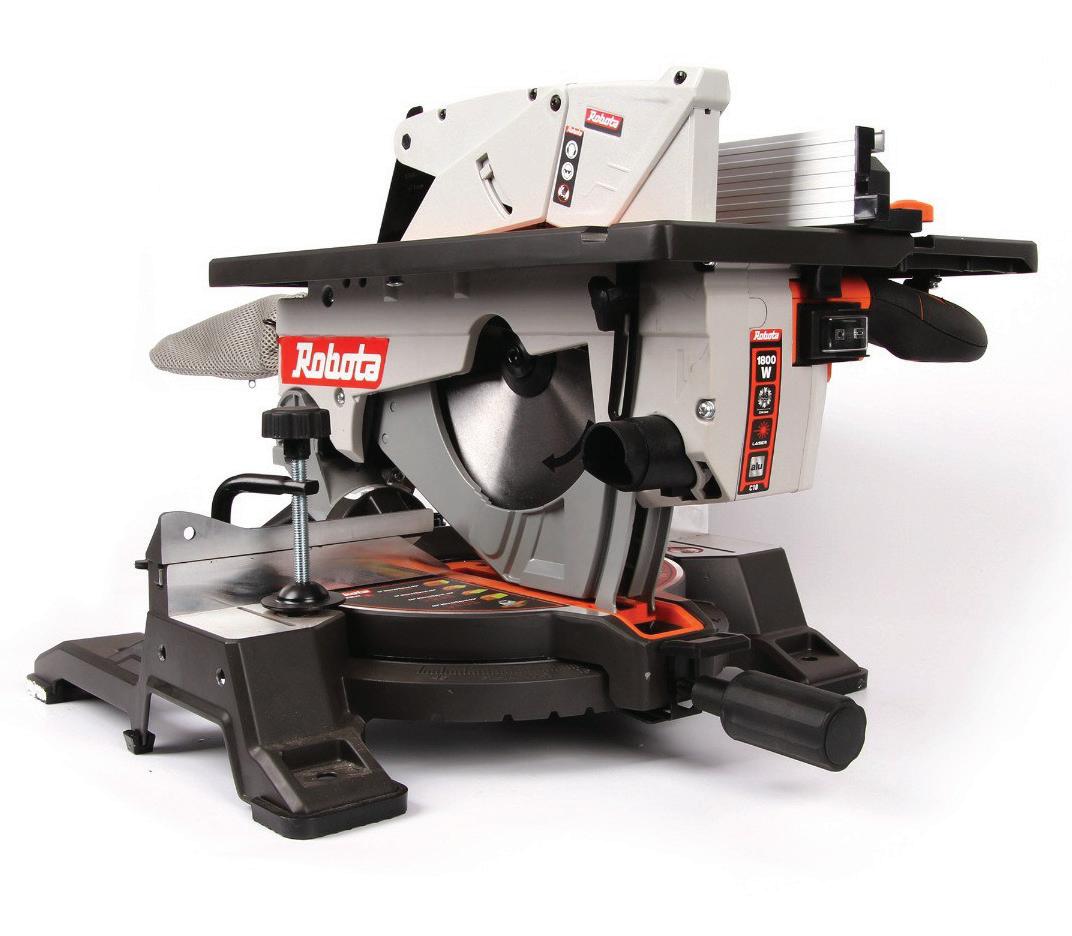 Robota yhdistelmäsaha lankkujen, levyjen ja listojen leikkaamiseen. Leikkuuviivan näyttävä laservalo mahdollistaa tarkat katkaisut. Pakkaus sisältää sahan, pölypussin ja halkaisuohjaimen.