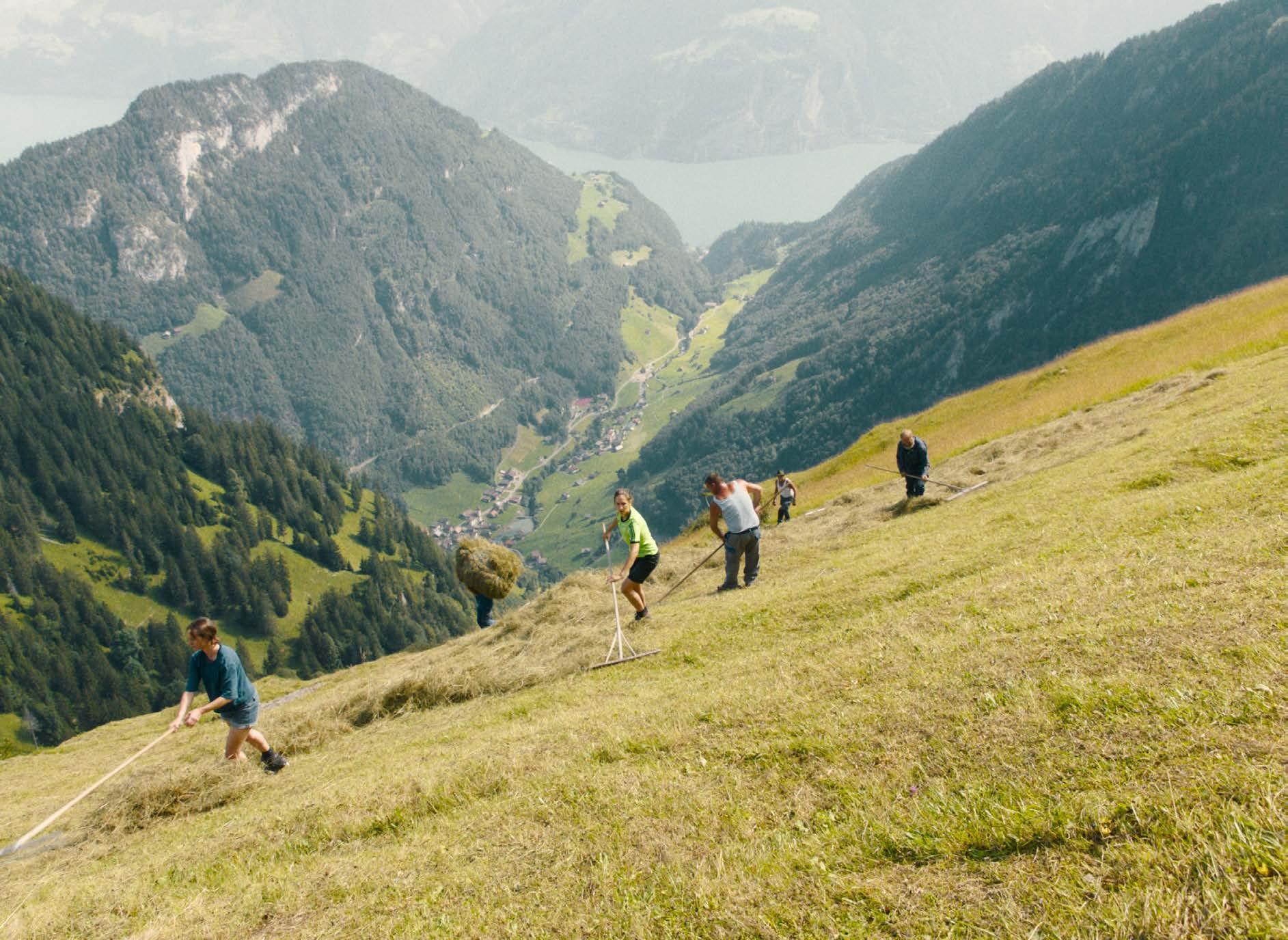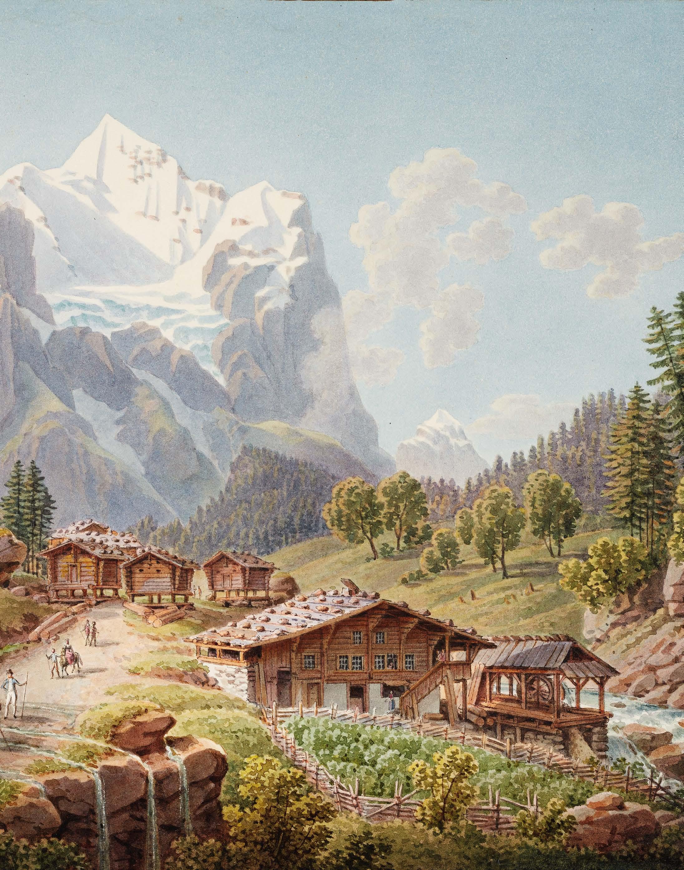 En 2023, la BN a présenté l’exposition « Chalet. Nostalgie, kitsch et culture du bâti » en coopération avec DAS GELBE HAUS FLIMS. Illustration (détail) : représentation de la Suisse et de ses chalets datant des débuts du romantisme. Gabriel Lory « Père », Glacier de Rosenlaui, 1823. Bibliothèque nationale suisse, Cabinet des estampes : collection Rudolf et Annemarie Gugelmann