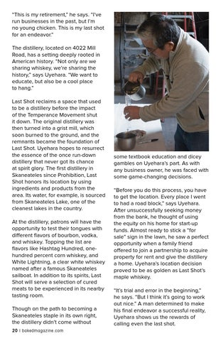 “This is my retirement,” he says. “I’ve run businesses in the past, but I’m no young chicken. This is my last shot for an endeavor.” The distillery, located on 4022 Mill Road, has a setting deeply rooted in American history. “Not only are we sharing whiskey, we’re sharing the history,” says Uyehara. “We want to educate, but also be a cool place to hang.” Last Shot reclaims a space that used to be a distillery before the impact of the Temperance Movement shut it down. The original distillery was then turned into a grist mill, which soon burned to the ground, and the remnants became the foundation of Last Shot. Uyehara hopes to resurrect the essence of the once run-down distillery that never got its chance at spirit glory. The first distillery in Skaneateles since Prohibition, Last Shot honors its location by using ingredients and products from the area. Its water, for example, is sourced from Skaneateles Lake, one of the cleanest lakes in the country. At the distillery, patrons will have the opportunity to test their tongues with different flavors of bourbon, vodka, and whiskey. Topping the list are flavors like Hashtag Hundred, onehundred percent corn whiskey, and White Lightning, a clear white whiskey named after a famous Skaneateles sailboat. In addition to its spirits, Last Shot will serve a selection of cured meats to be experienced in its nearby tasting room. Though on the path to becoming a Skaneateles staple in its own right, the distillery didn’t come without 20 | bakedmagazine.com