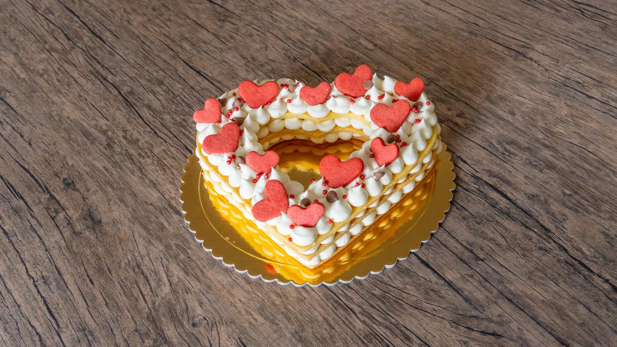 Decorar con grageas y galletas en forma de corazón.