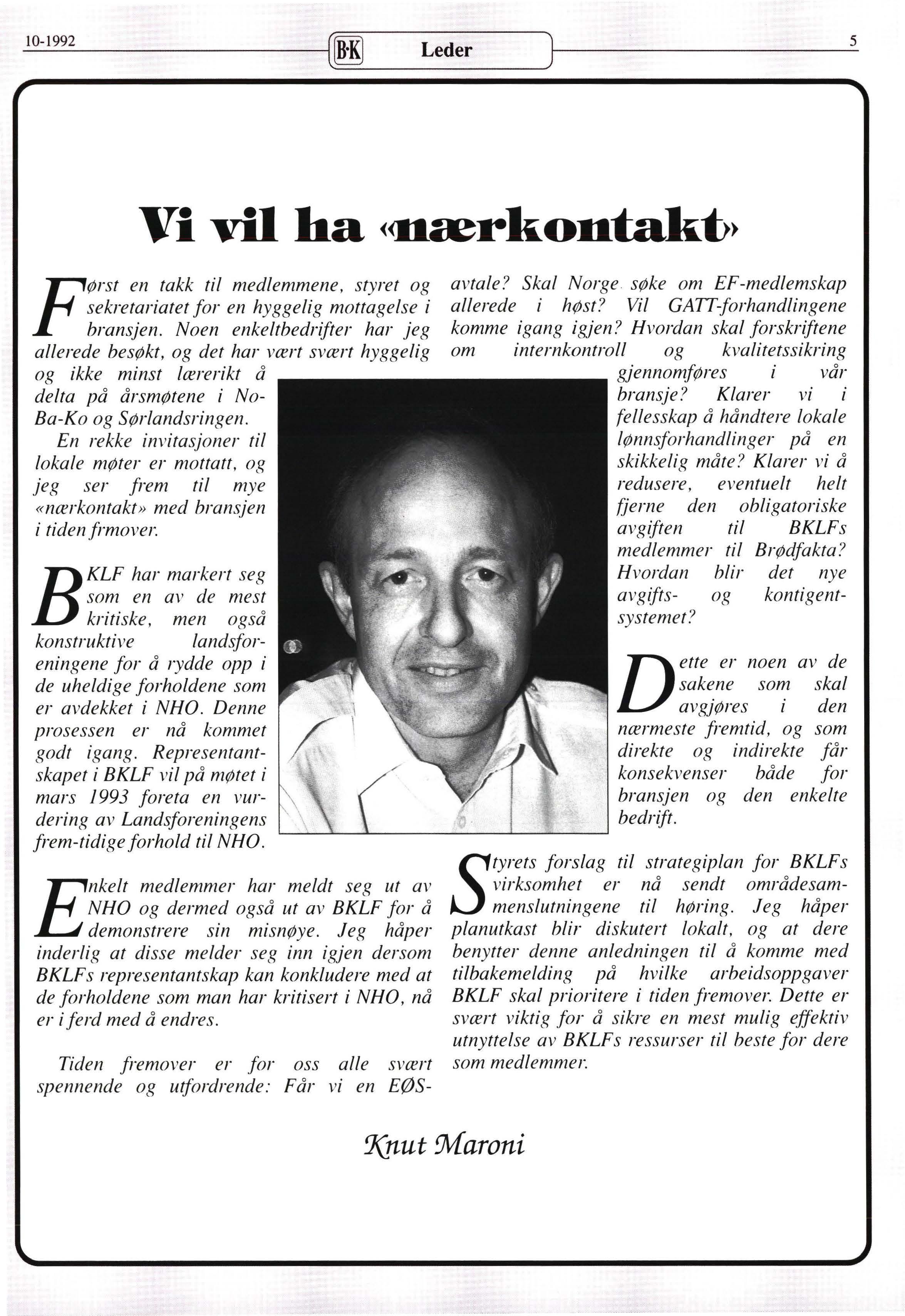 avtale? Skal Norge søke om EF-medlemskap allerede i høst ? Vil GATT-forhandlingene komme igang igjen? Hvordan skal forskriftene om internkontroll og kvalitetssikring gjennomføres i vår bransje? Klarer vi i fellesskap å håndtere lokale lønnsforhandlinger på en skikkelig måte ? Klarer vi å redusere, eventuelt helt fjerne den obligatoriske avgiften til BKLFs medlemmer til Brødfakta? Hvordan blir det nye avgifts- og kontigentsystemet?