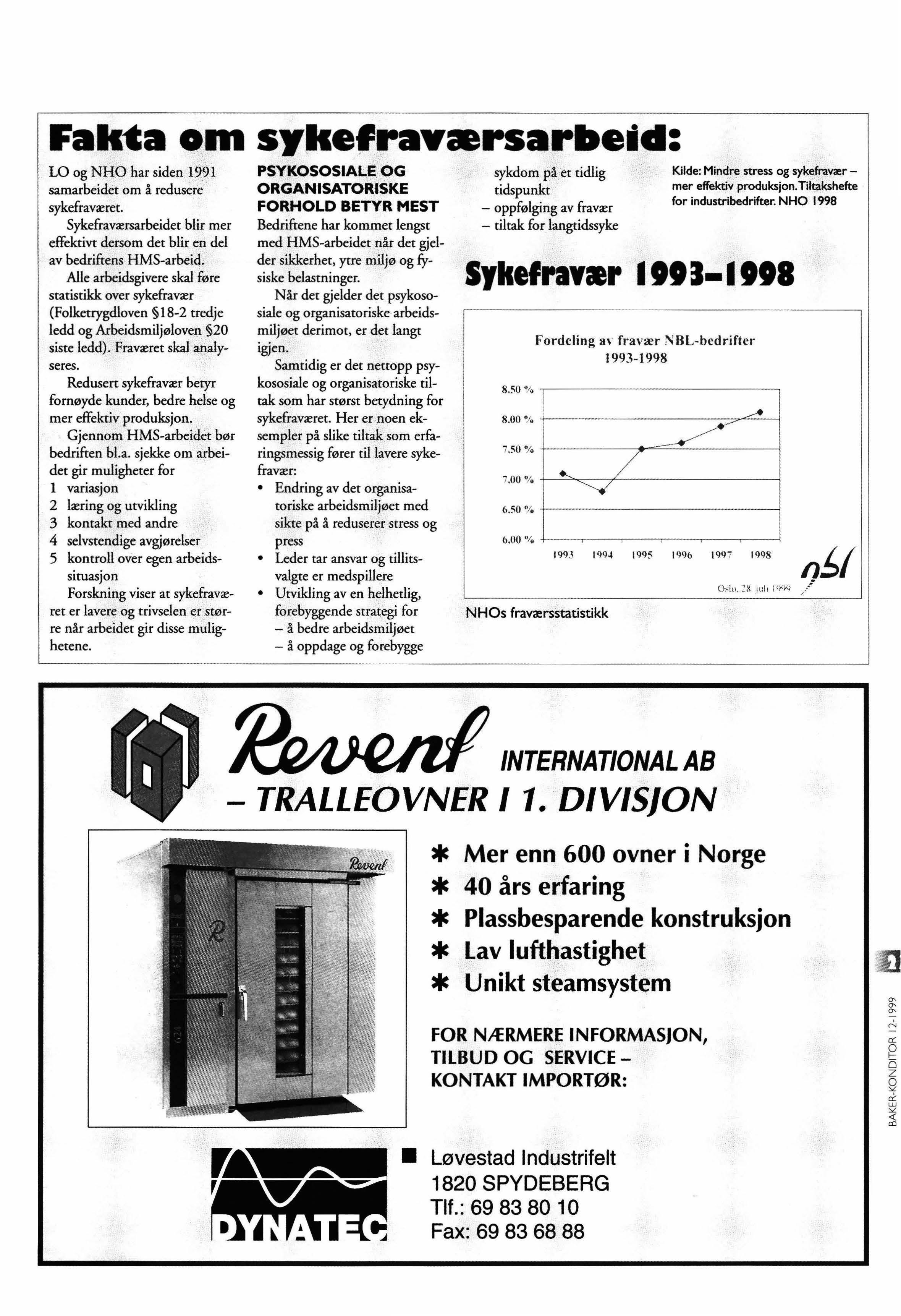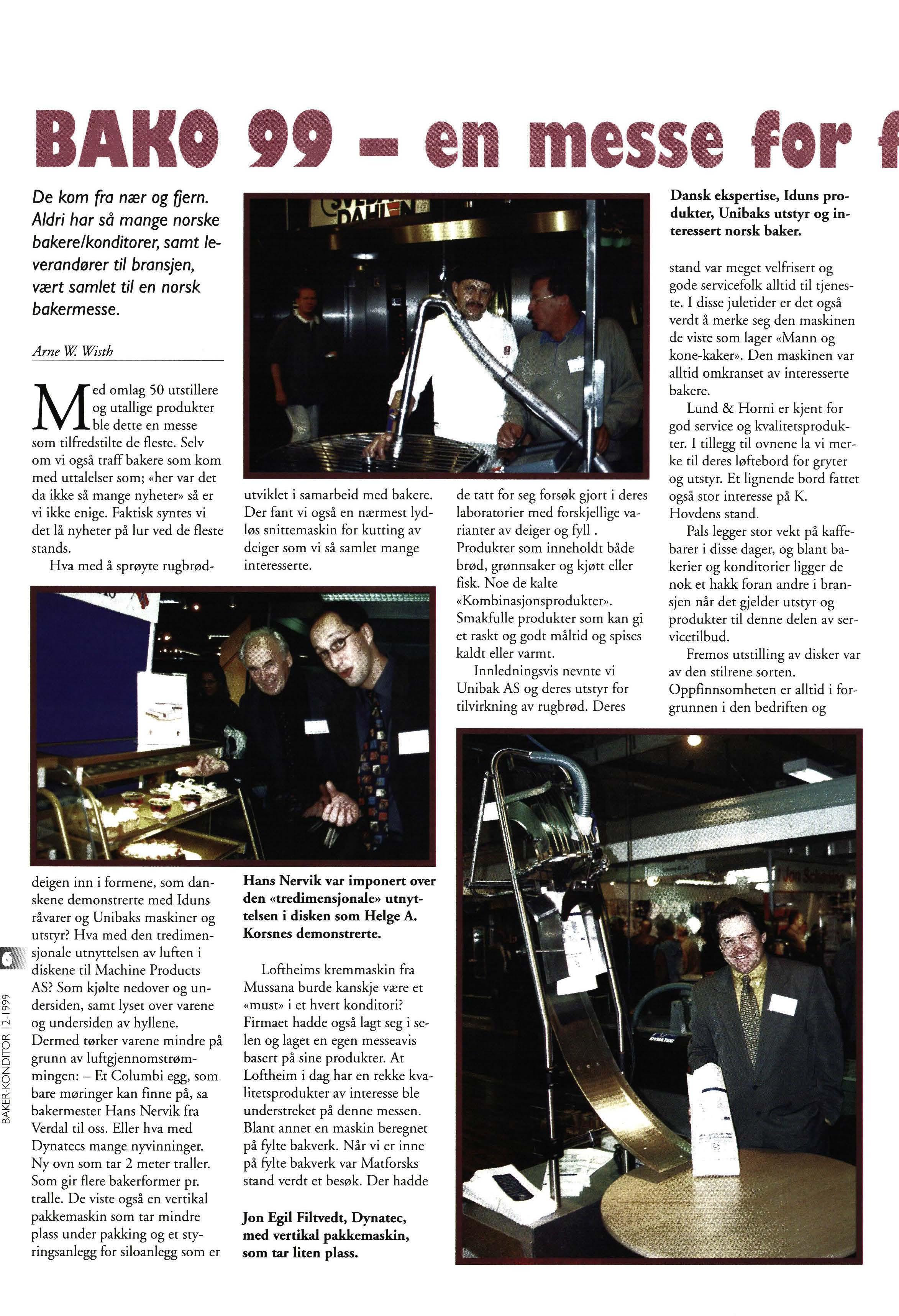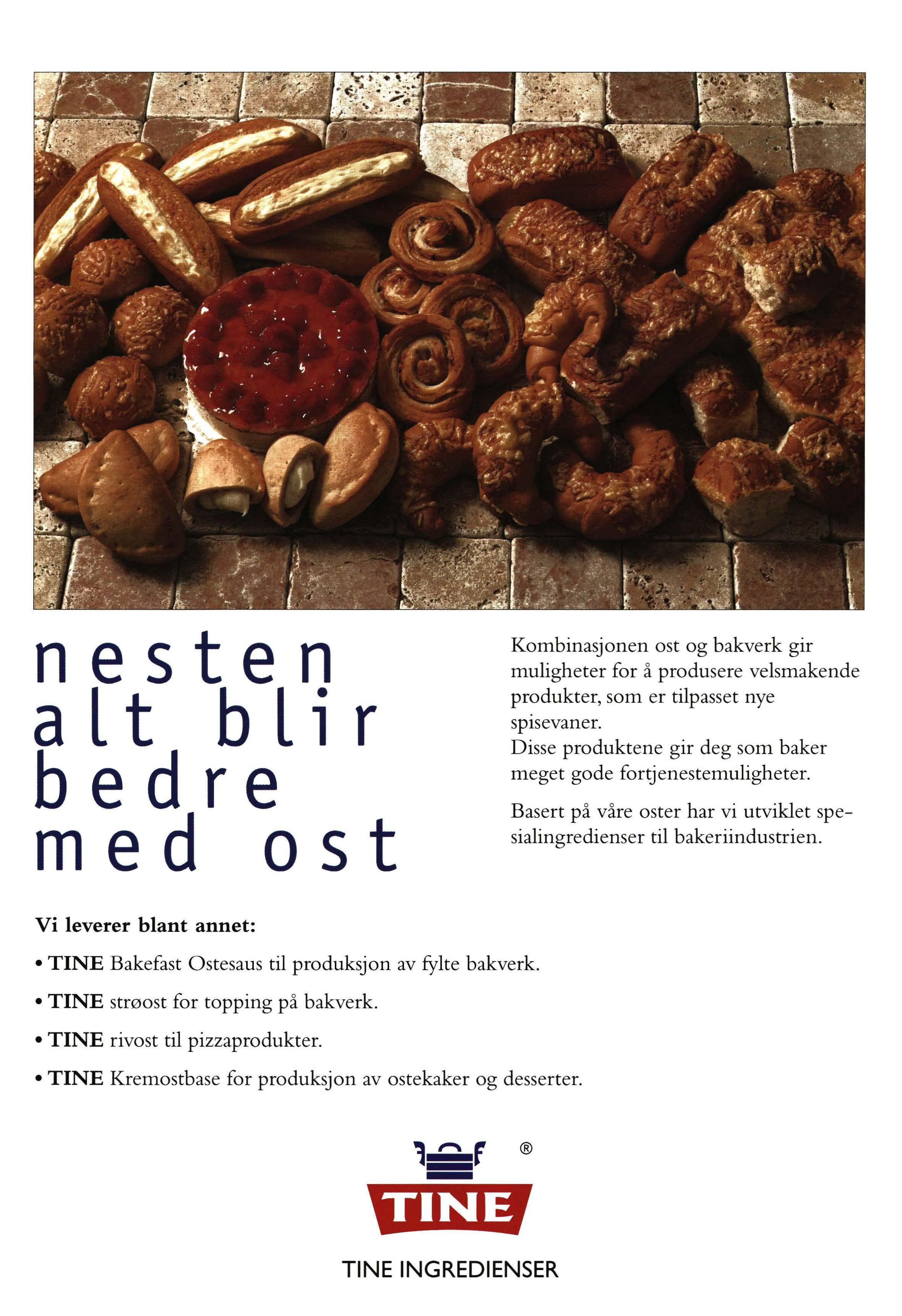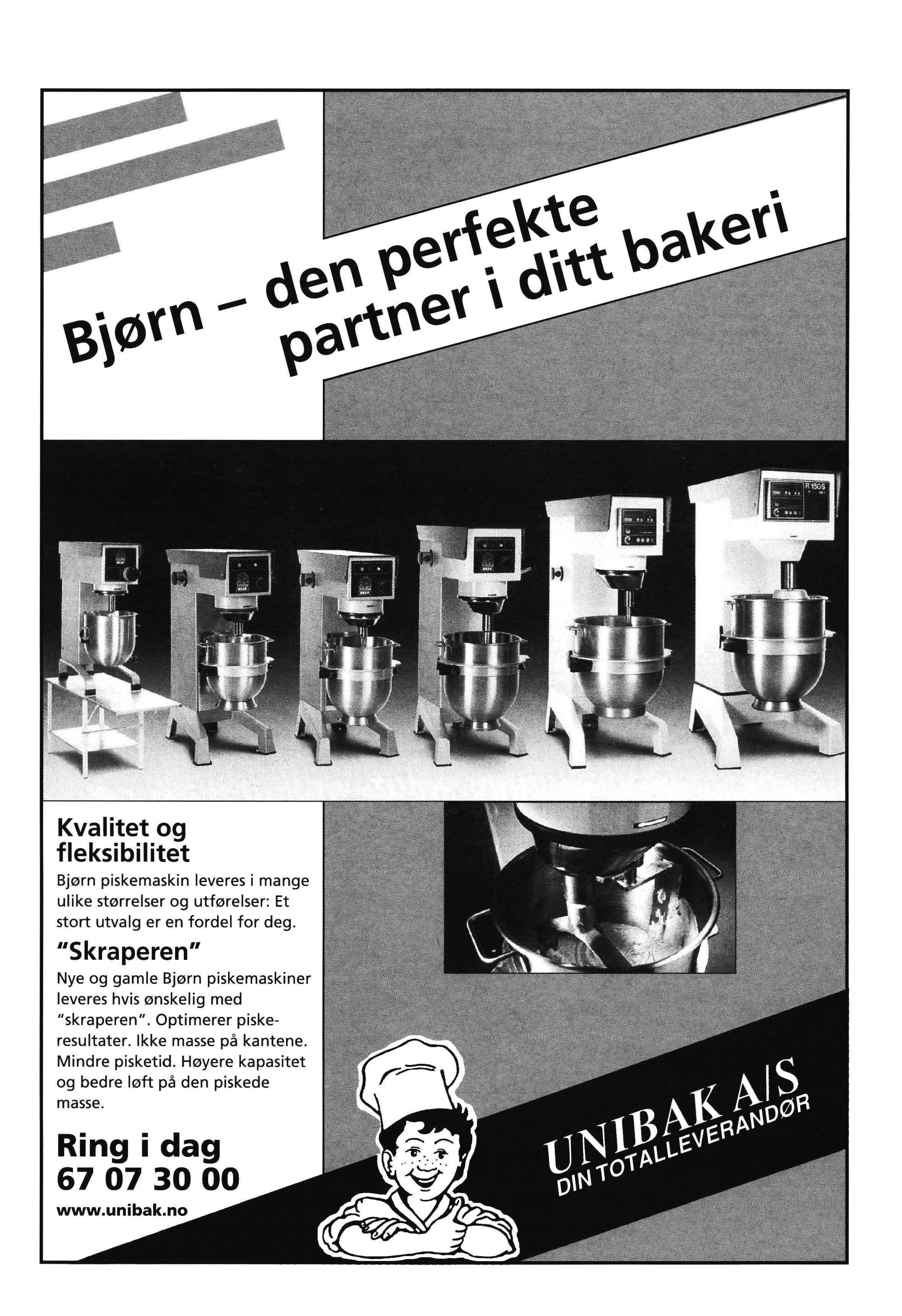 deigen inn i formene, som danskene demonstrerte med Iduns råvarer og Unibaks maskiner og utsryr? Hva med den tredimensjonale utnyttelsen av luften i diskene ril Machine Products AS? Som kjølte nedover og undersiden, samt lyset over varene og undersiden av hyllene. Dermed tørker varene mindre på grunn av luftgjennomstrømmingen: - Et Columbi egg, som bare møringer kan finne på, sa bakermester Hans Nervik fra Verdal ril oss. Eller hva med Dynatecs mange nyvinninger. Ny ovn som tar 2 meter traller. Som gir flere bakerformer pr. tralle. De viste også en vertikal pakkemaskin som tar mindre plass under pakking og et sryringsanlegg for siloanlegg som er