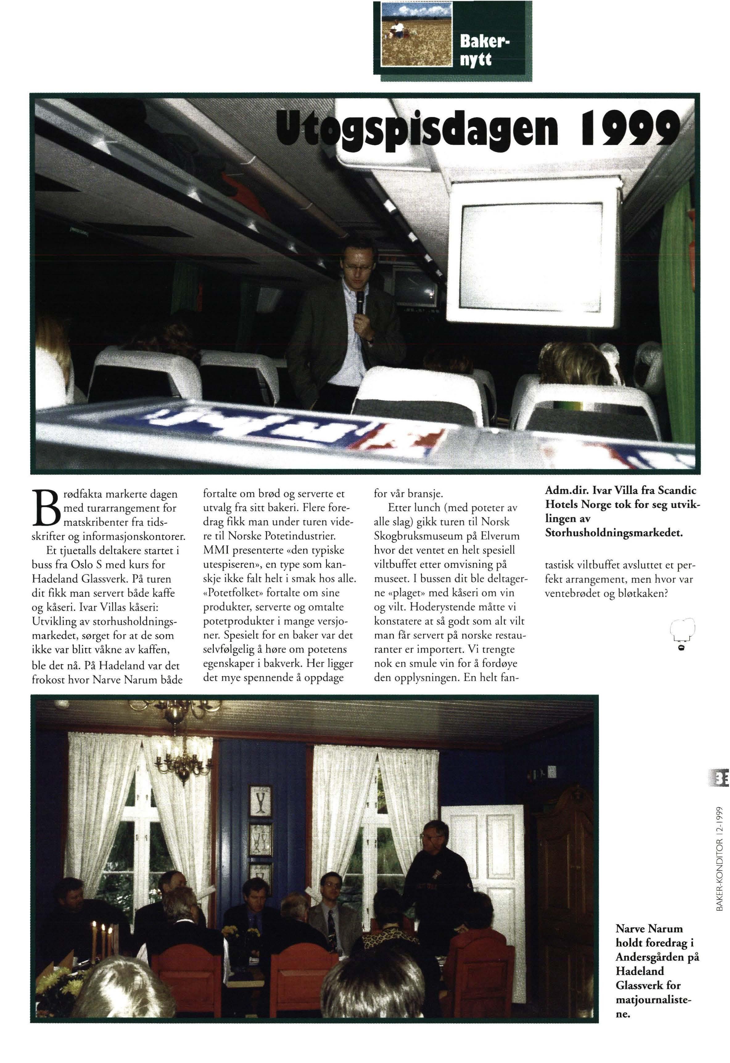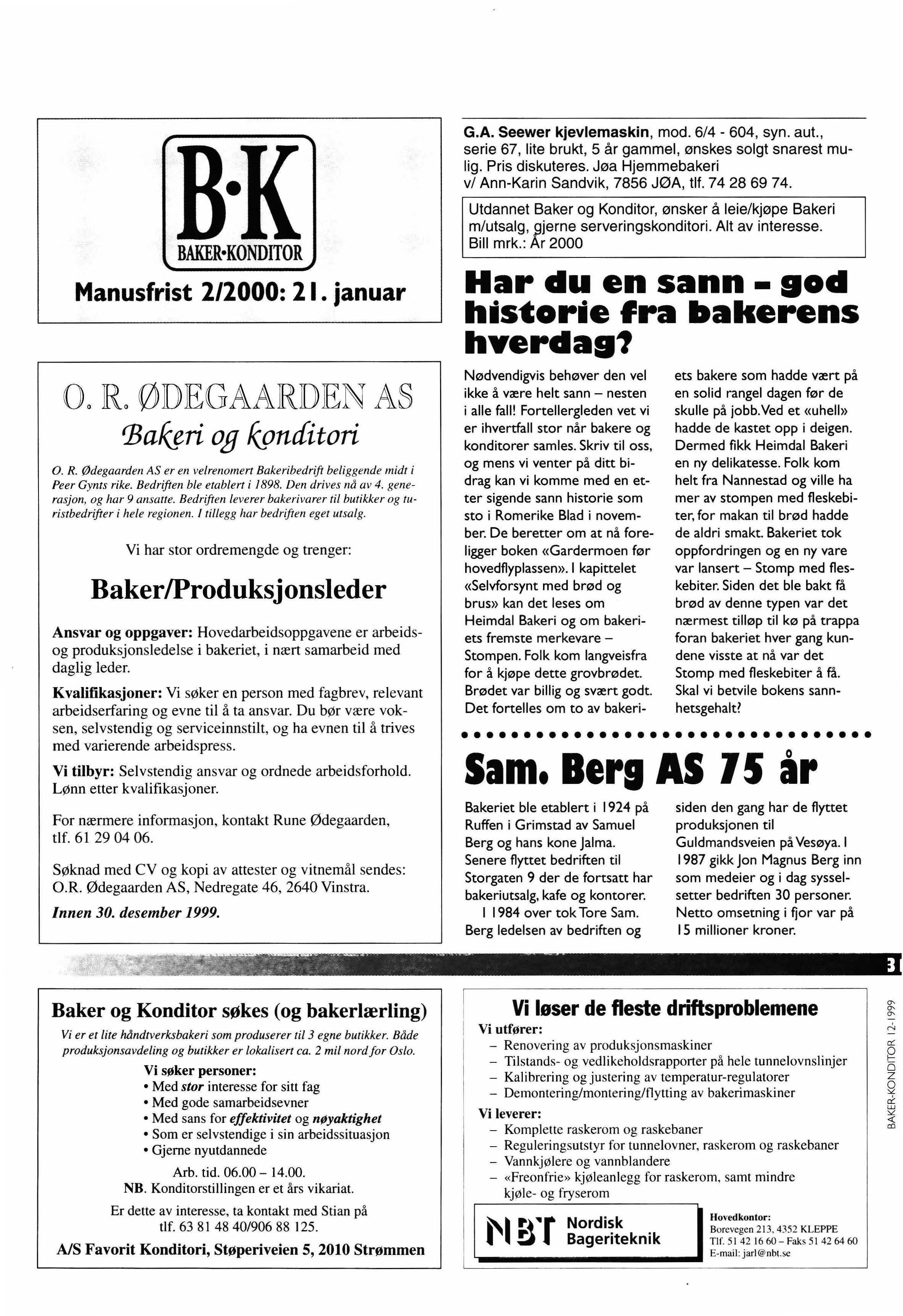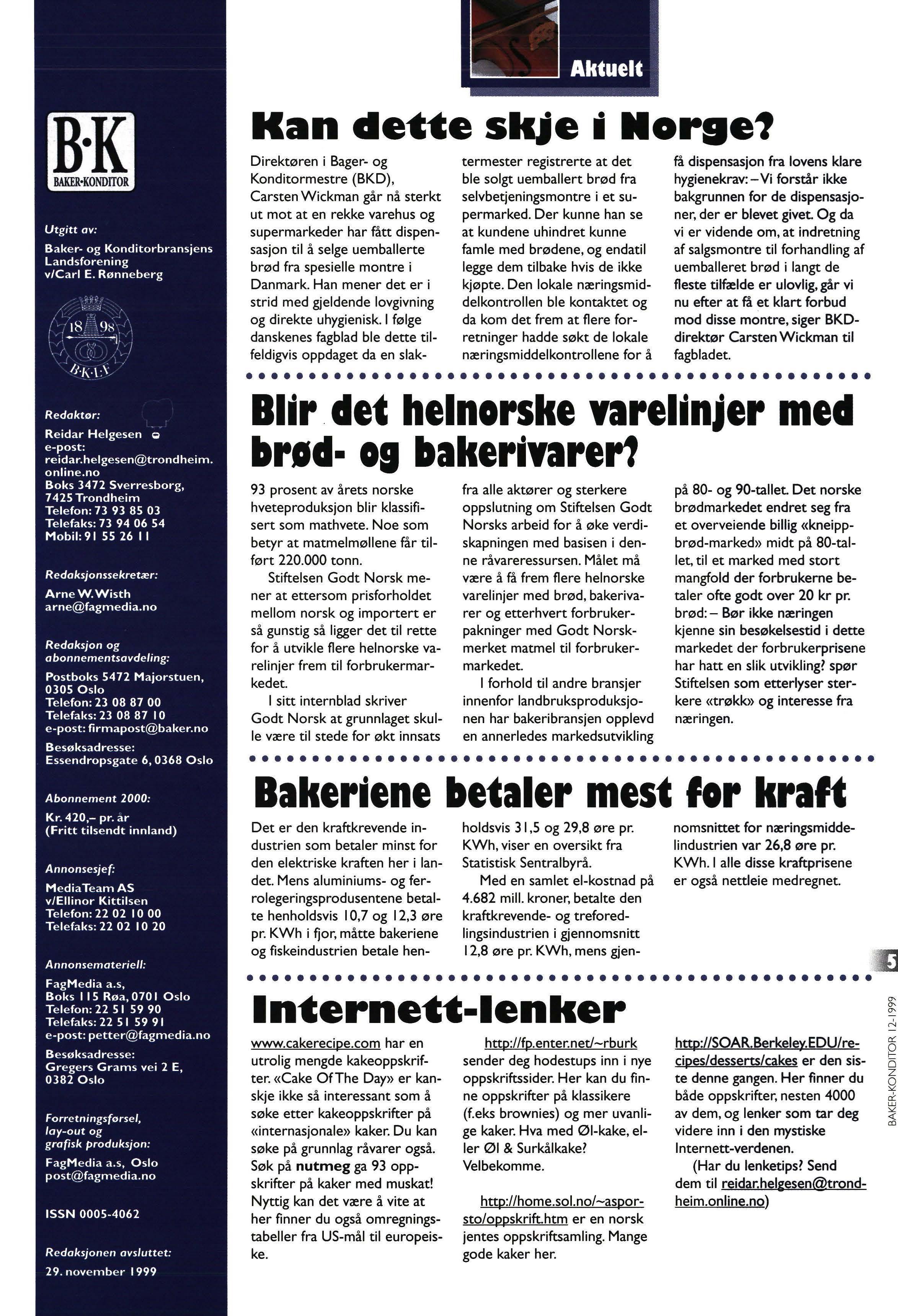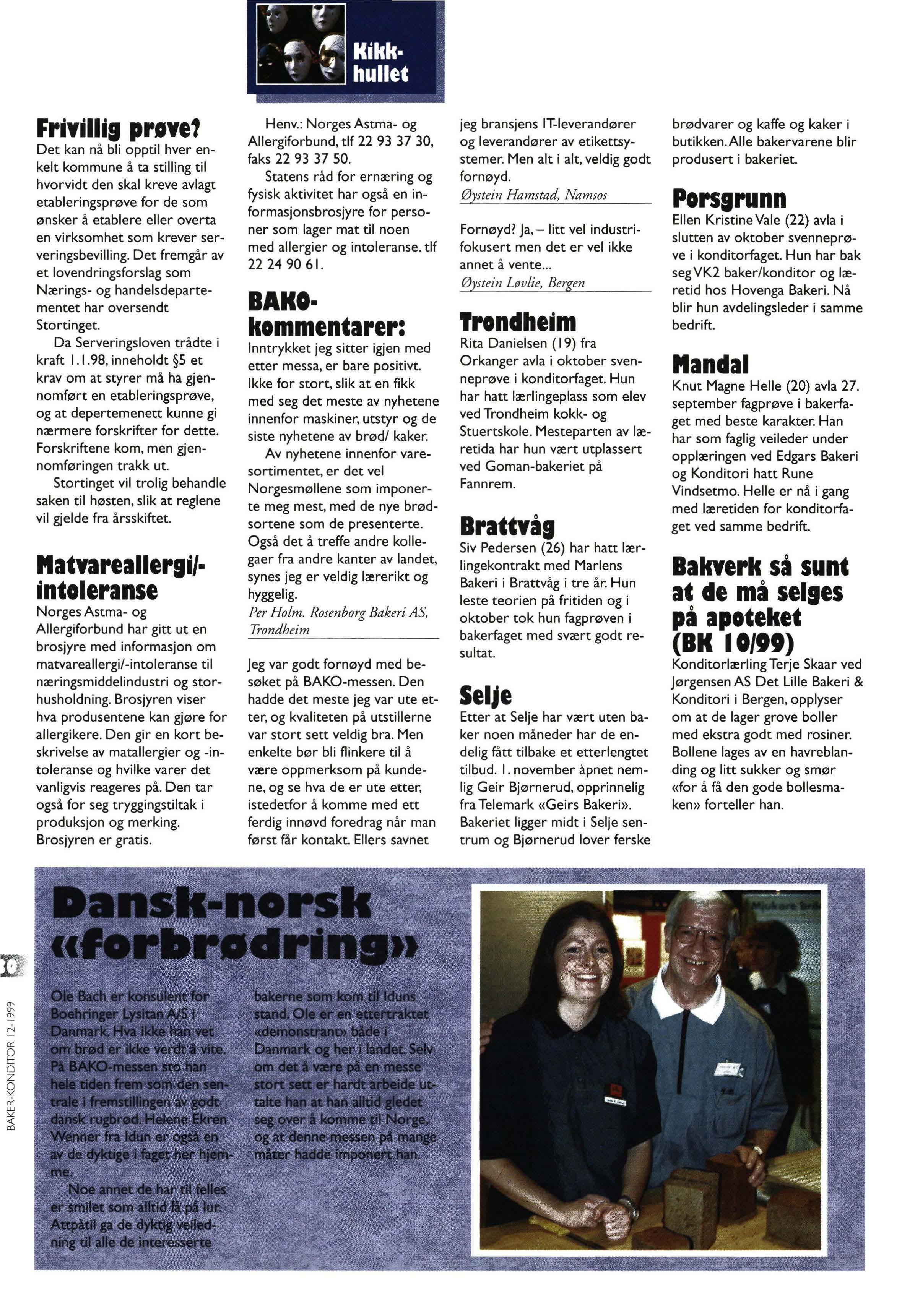 snart skal vi glemme at det på sykehusene kjempestore til alle de samme problemene 19-tallet og begynne kan oppstå virkelig al- mulige bortforklaring- fordi de ikke følger å bruke 20 foran årstal- vorlige «cases», ja til og er samme kalender som let Det burde gå greitt, med «worst» sådanne Dessuten kan man oss. Forhåpentligvis for det er vel mindre selv om de neppe vil forklare hvorfor bruker de ikke vår teksjanse for å glemme ramme hele samfunnet man ikke ringer til ven- nologi heller. seg etter dette årsskif- som sådant. ner og kjente - en vil tet enn etter det forri- jo ikke overbelaste te- Mal urten i begeret ge År 2000-probleme- Kanskje man skulle lenettet i krisetider for oss bakere og ne eller «Y2K»- pro- se positivt på det? Ikke bør man besøke konditorer er vel at vi blemene som det heter Nå kan alle skylde på noen heller, for flyturer hører med til dem som på dataspråk, får vi år 2000 om noe ikke sånn rett etter over- møter eventuelle prosnart se om eksisterer fungerer I 00% som det gangen fra 99 til 00, blemer ganske tidlig på i virkeligheten eller om skal. Brente brød, nei, det bør man ikke året. Det er vel nok av det er en form for kri- sprukne brød, flate risikere. Togturer er dem som skal starte semaksimering i hode- brød, forsinka brød, ikke mye bedre i så bakeriet i I 0-tida på ne våre. smakløse brød, råe måte, og hvem vet om kvelden første nyttårsbrød - vel, du skjønner ABS-bremsene på bilen dag. Lykke til. Mens