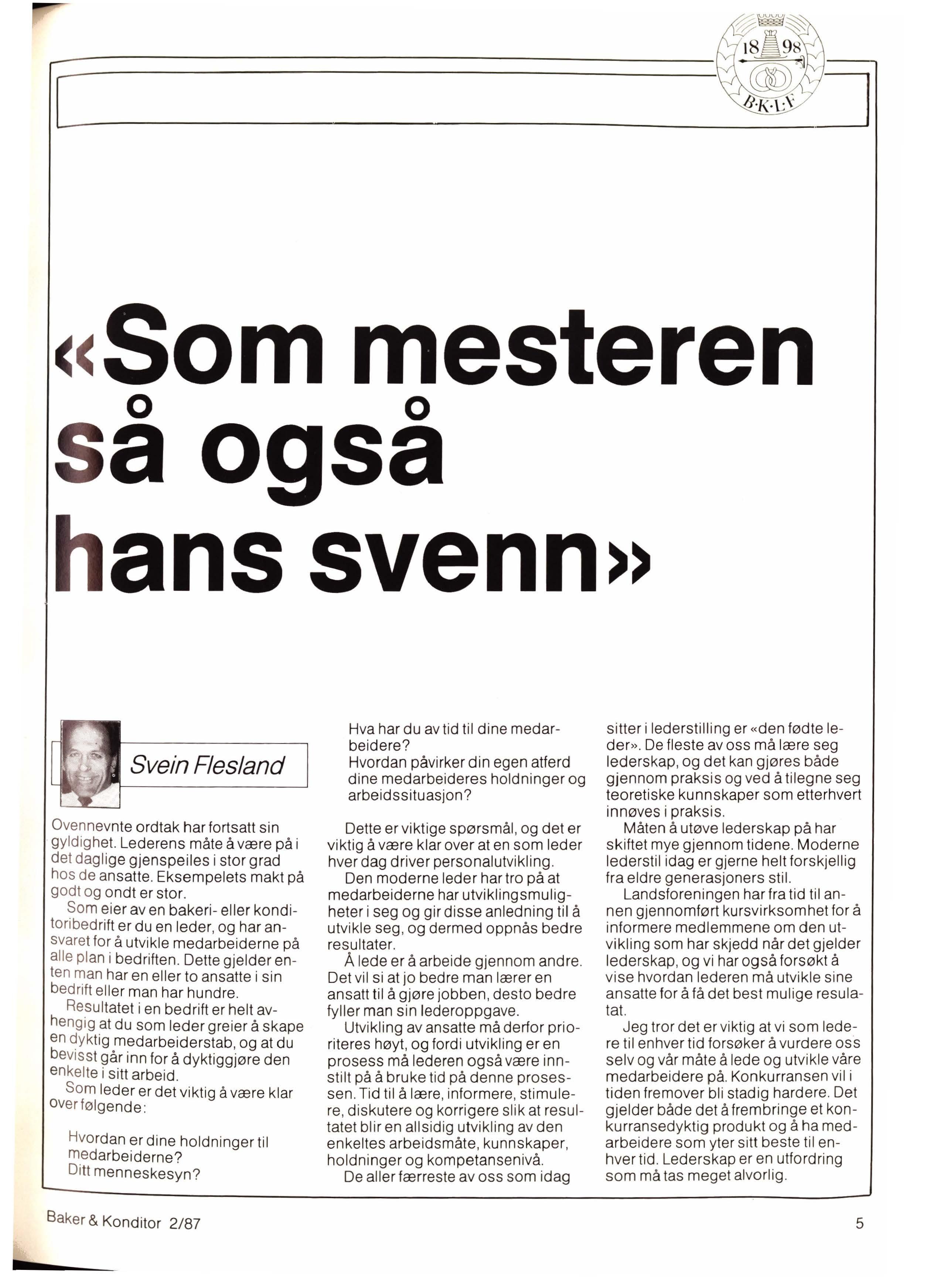 Som e ier av en bakeri- eller konditoribe dr ift er du en leder , og har ansvaret fo r å utvikle medarbeiderne på alle pla n i bedriften. Dette gjelder enten man har en eller to ansatte i sin bedrift el ler man har hundre