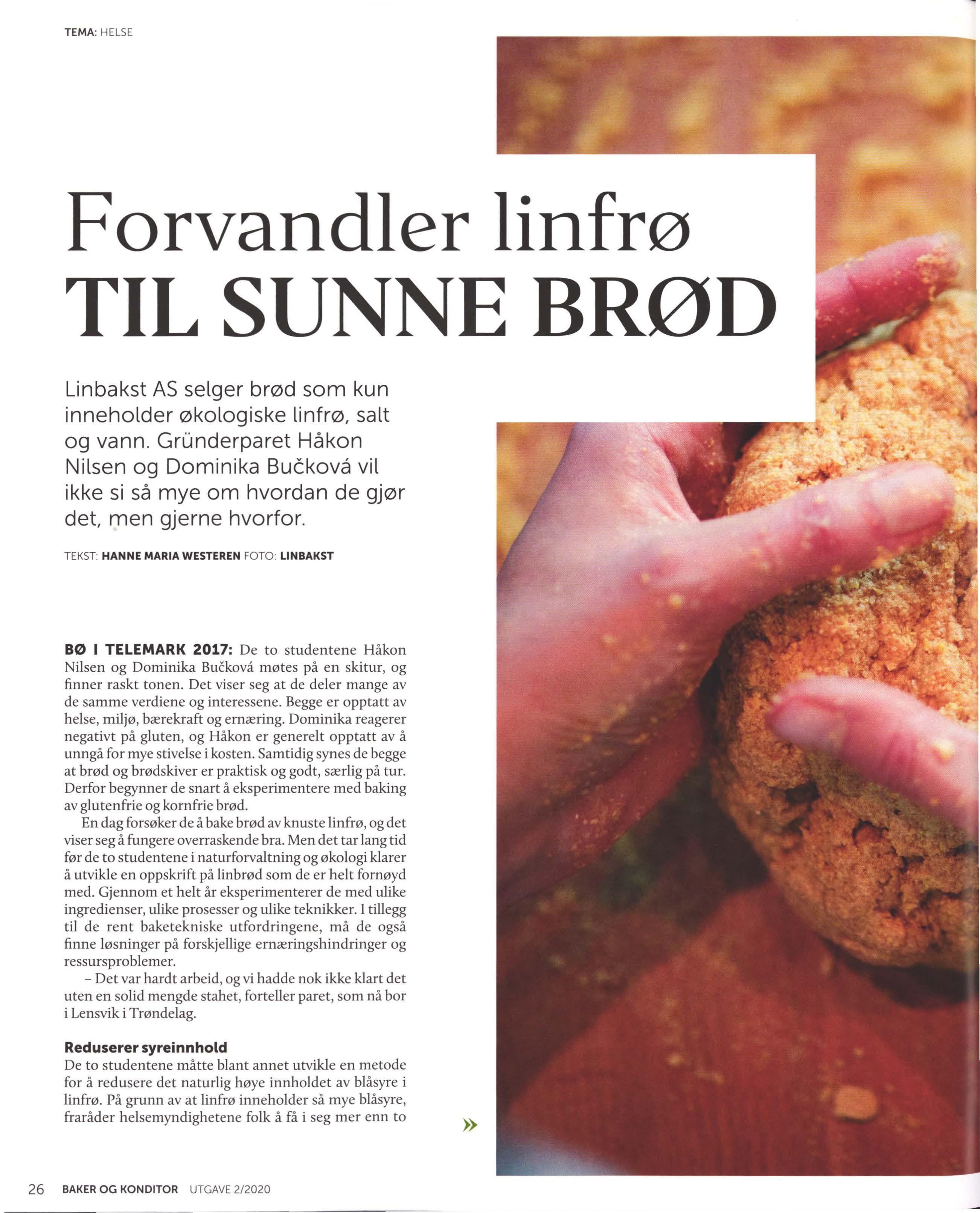 bærekraftige og sunne 5 Kalde nyheter Hennig-Olsen Is lanserer fem nye smaker til kuleis-disken . 30 Sjokolade- og pistasjdessert Prøv oppskriften på svampekake med kakao , mørk sjokoladekrem og pistasjis Innhold LEDER BKLF Et viktig an sv ar 6 SMÅNYTT Fra Norge 7 ÅRETS BAKERI Her er de nominerte 8 STEINMALT MEL Nytt mølle-samarbeid 9 CEREALFAGDAGEN Programmet er klart 10 HEVD HÅNDVERKSBAKERI Storsatsing i Trondheim 12 SMÅNYTT Fra me sser og konkurranser 18 Om emballasjetrender 19 Om sunne mattrender 20 BAKERENS HELSE Tilrettelagte arbeid splasser 22 LINBAKST Helsebrød av linfrø 26 OPPSKRIFT Sjokoladesvamp med pistasjis 30 SMÅNYTT Fra leverandørene 34